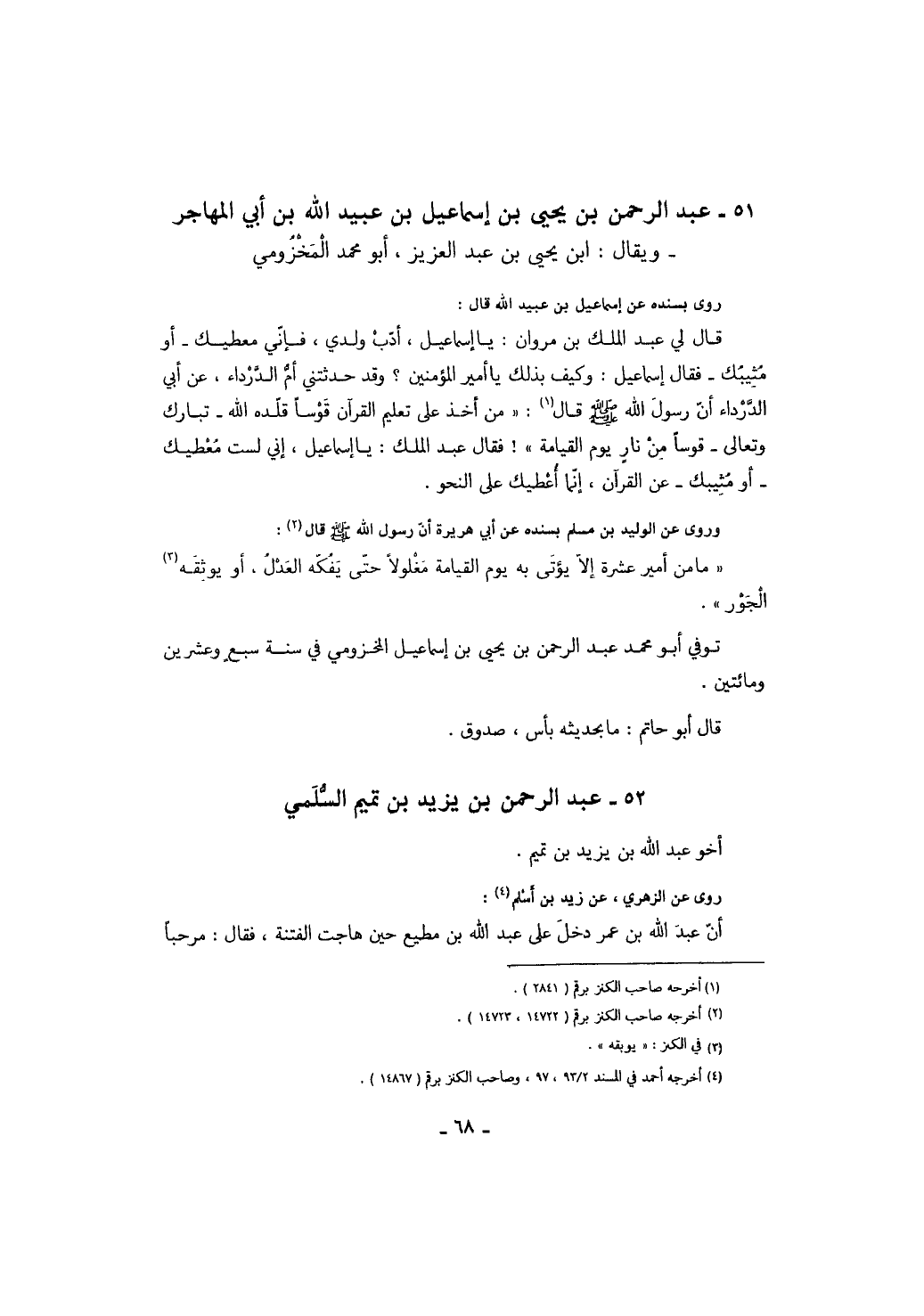 وروى عن الوليد بن مسلم بسنده عن أبي هريرة أن رسول الله صَلَّى اللهُ عَلَيْهِ وَسَلَّمَ قال: " ما من أمير عشرة إلا يؤتى به يوم القيامة مغلولاً حتى يفكه العدل، أو يوثقه الجور " توفي أبو محمد عبد الرحمن بن يحيى بن اسماعيل المخزومي في سنة سبعٍ وعشرين ومائتين.