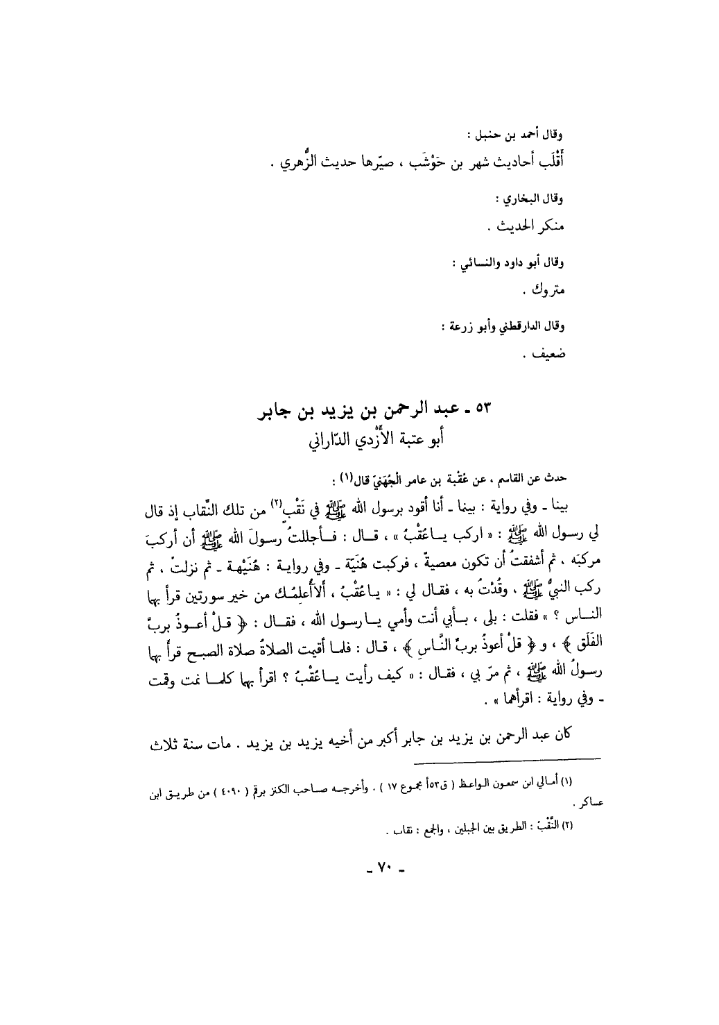 أبو عتبة الأزدي الداراني حدث عن القاسم، عن عقبة بن عامر الجهني قال: بينا - وفي رواية: بينما - أنا أقود برسول الله صَلَّى اللهُ عَلَيْهِ وَسَلَّمَ في نقب من تلك النقاب إذ قال لي رسول الله صَلَّى اللهُ عَلَيْهِ وَسَلَّمَ: " اركب ياعقب "، قال: فأجللت رسول الله صَلَّى اللهُ عَلَيْهِ وَسَلَّمَ أن أركب مركبه، ثم أشفقت أن تكون معصية "، فركبت هنية - وفي رواية: هنيهة - ثم نزلت، ثم ركب النبي صَلَّى اللهُ عَلَيْهِ وَسَلَّمَ، وقدت به، فقال لي: " يا عقب، ألا أعلمك من خير سورتين قرأ بهما الناس؟ فقلت: بلى، بأبي أنت وأمي يا رسول الله، فقال: " قل أعوذ برب الفلق "، و" قل أعوذ برب الناس "، قال: فلما أقيمت الصلاة صلاة الصبح قرأ بهما رسول الله صَلَّى اللهُ عَلَيْهِ وَسَلَّمَ، ثم مر بي، فقال: كيف رأيت يا عقب؟ اقرأ بهما كلما نمت وقمت - وفي رواية: اقرأهما " كان عبد الرحمن بن يزيد بن جابر أكبر من أخيه يزيد بن يزيد. مات سنة ثلاث