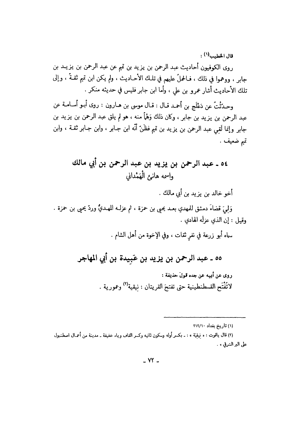 عبد الرحمن بن يزيد بن عبيدة بن أبي المهاجر روى عن أبيه عن جده قول حذيفة: لاتفتح القسطنطينة حتى تفتح القريتان: نيقية وعمورية؟