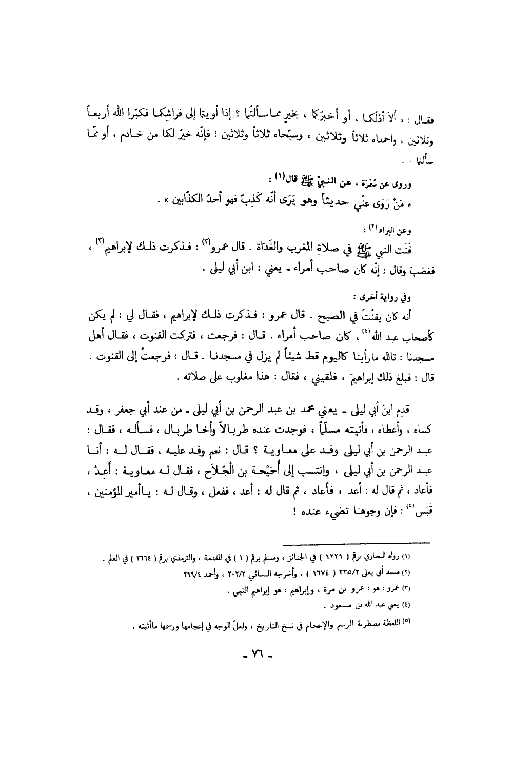 فقال: " ألا أدلكما، أو أخبركما، بخير مما سألتما؟ إذا أويتما إلى فراشكما فكبرا الله أربعاً وثلاثين، واحمداه ثلاثاً وثلاثين؛ فإنه خير لكما من خادم، أو مما سألتما " وروى عن سمرة، عن النبي صَلَّى اللهُ عَلَيْهِ وَسَلَّمَ قال: " من روى عني حديثاً وهو يرى أنه كذب فهو أحد الكذابين " وعن البراء: أنه كان يقنت في الصبح. قال عمرو: فذكرت ذلك لإبراهيم، فغضب وقال: إنه كان صاحب أمراء - يعني: ابن أبي ليلى وفي رواية أخرى: أنه كان يقنت في الصبح. قال عمرو: فذكرت ذلك لإبراهيم، فقال لي: لم يكن كأصحاب عبد الله، كان صاحب أمراء. قال: فرجعت، فتركت القنوت، فقال أهل مسجدنا: تالله ما رأينا كاليوم قط شيئاً لم يزل في مسجدنا. قال: فرجعت إلى القنوت. قال: فبلغ ذلك إبراهيم، فلقيني، فقال: هذا مغلوب على صلاته.