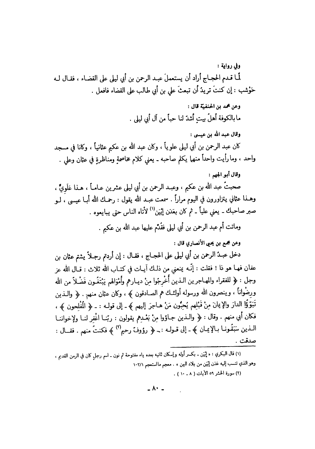 وعن مجمع بن يحيى الأنصاري قال: دخل عبد الرحمن بن أبي ليلى على الحجاج، فقال: إن أردتم رجلاً يشتم عثمان بن عفان فها هو ذا؟. فقلت: إنه يمنعني من ذلك آيات في كتاب الله ثلاثاً: قال الله عز وجل: " للفقراء والمهاجرين الذين أخرجوا من ديارهم وأموالهم يبتغون فضلاً من الله ورضواناً، وينصرون الله ورسوله أولئك هم الصادقون "، وكان عثمان منهم. " والذين تبوؤا الدار والإيمان من قبلهم يحبون من هاجر إليهم " إلى قوله: " المفلحون "، فكان أبي منهم. وقال: " والذين جاؤوا من بعدهم يقولون: ربنا اغفر لنا ولإخواننا الذين سبقونا بالإيمان " - إلى قوله: " رؤوف رحيم " فكنت منهم، فقال: صدقت