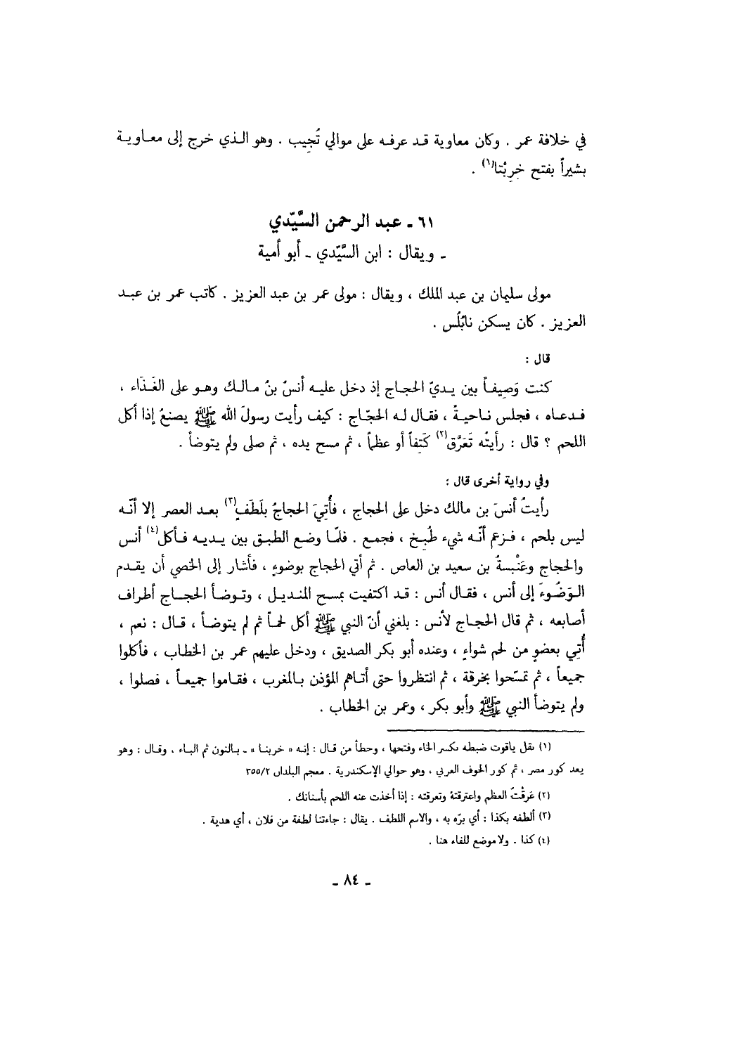 قال: كنت وصيفاً بين يدي الحجاج إذ دخل عليه أنس بن مالك وهو على الغداء، فدعاه، فجلس ناحية "، فقال له الحجاج: كيف رأيت رسول الله صَلَّى اللهُ عَلَيْهِ وَسَلَّمَ يصنع إذا أكل اللحم؟ قال: رأيته تعرق كتفاً أو عظماً، ثم مسح يده، ثم صلى ولم يتوضأ.