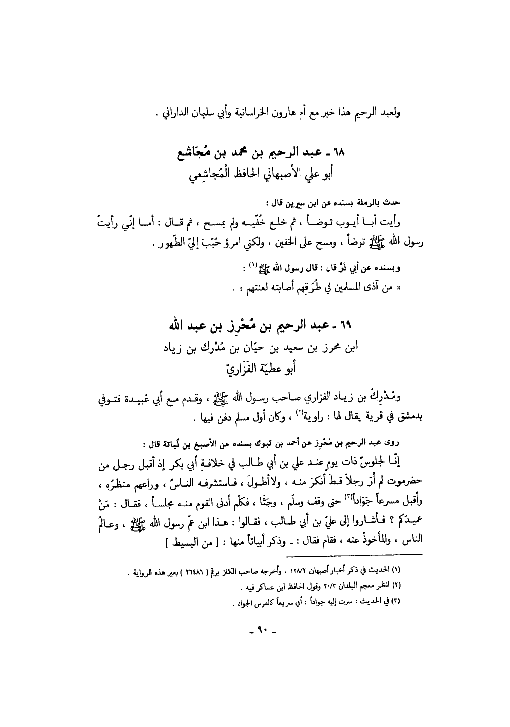 أبو علي الأصبهاني الحافظ المجاشعي حدث بالرملة بسنده عن ابن سيرين قال: رأيت أبا أيوب توضأ، ثم خلع خفيه ولم يمسح، ثم قال: أما إني رأيت رسول الله صَلَّى اللهُ عَلَيْهِ وَسَلَّمَ توضأ، ومسح على الخفين، ولكني امرؤ حبب إلى الطهور.