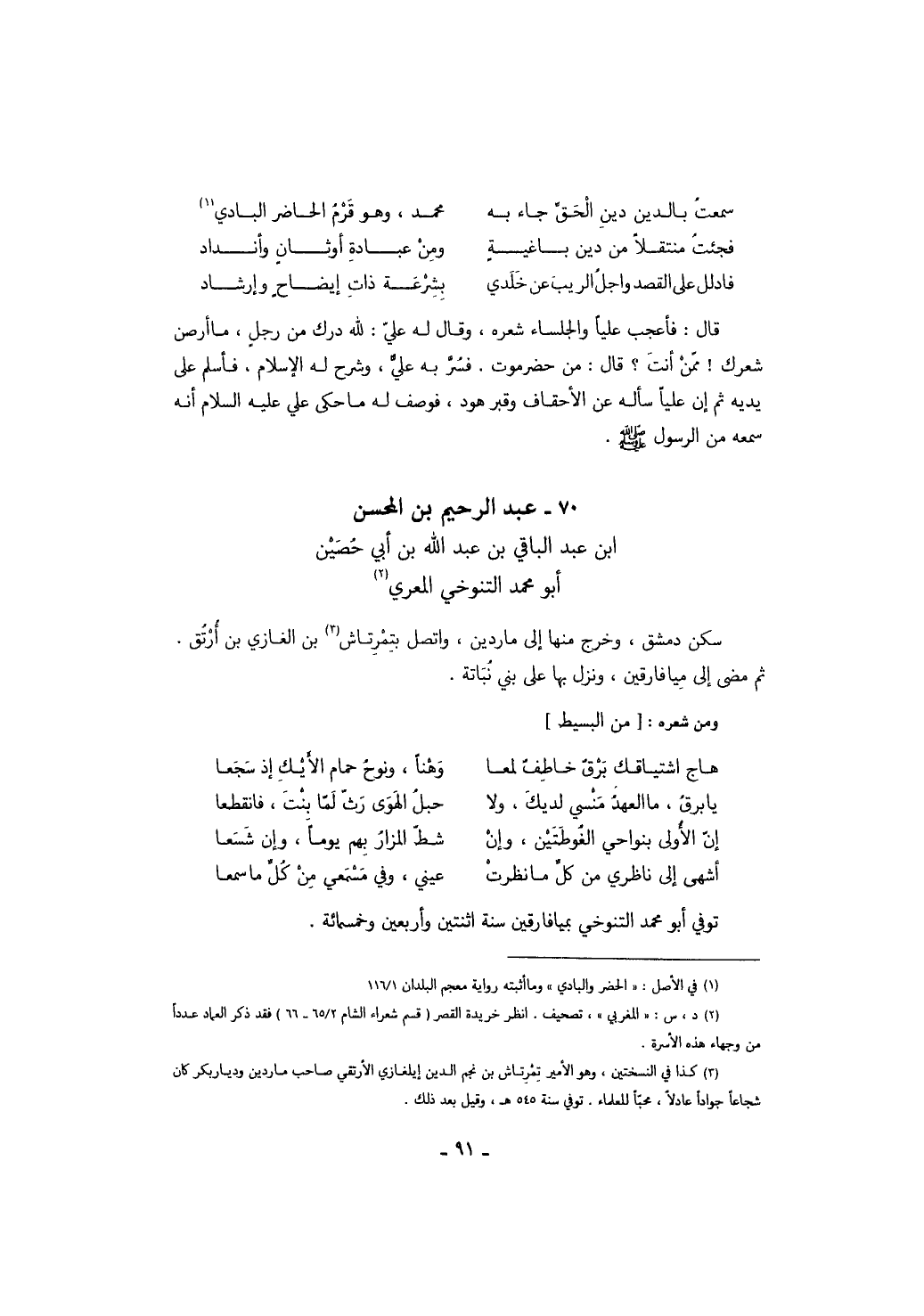 ابن عبد الباقي بن عبد الله بن أبي حصين أبو محمد التنوخي المعري سكن دمشق، وخرج منها إلى ماردين، واتصل بتمرتاش بن الغازي بن أرتق. ثم مضى إلى ميا فارقين، ونزل بها على بني نباته.