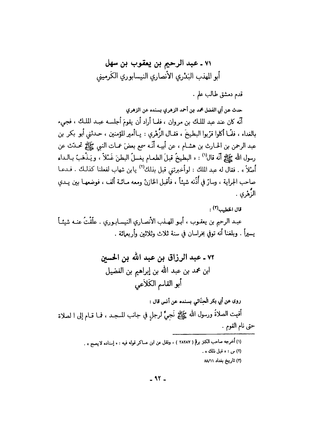 أبو المهذب البدري الأنصاري النيسابوري الكرميني قدم دمشق طالب علم حدث عن أبي الفضل محمد بن أحمد الزهري بسنده عن الزهري أنه كان عند عبد الملك بن مروان، فلما أراد أن يقوم أجلسه عبد الملك، فجيء بالغداء، فلما أكلوا قربوا البطيخ، فقال الزهري: يا أمير المؤمنين، حدثني أبو بكر بن عبد الرحمن بن الحارث بن هشام، عن أبيه أنه سمع بعض عمات النبي صَلَّى اللهُ عَلَيْهِ وَسَلَّمَ تحدث عن رسول الله صَلَّى اللهُ عَلَيْهِ وَسَلَّمَ أنه قال: " البطيخ قبل الطعام يغسل البطن غسلاً، ويذهب بالداء أصلاً. فقال له عبد الملك: لو أخبرتني بذلك يا بن شهاب لفعلنا كذلك. فدعا صاحب الجراية، وسار في أذنه شيئاً، فأقبل الخازن ومعه مائة ألف، فوضعها بين يدي الزهري.