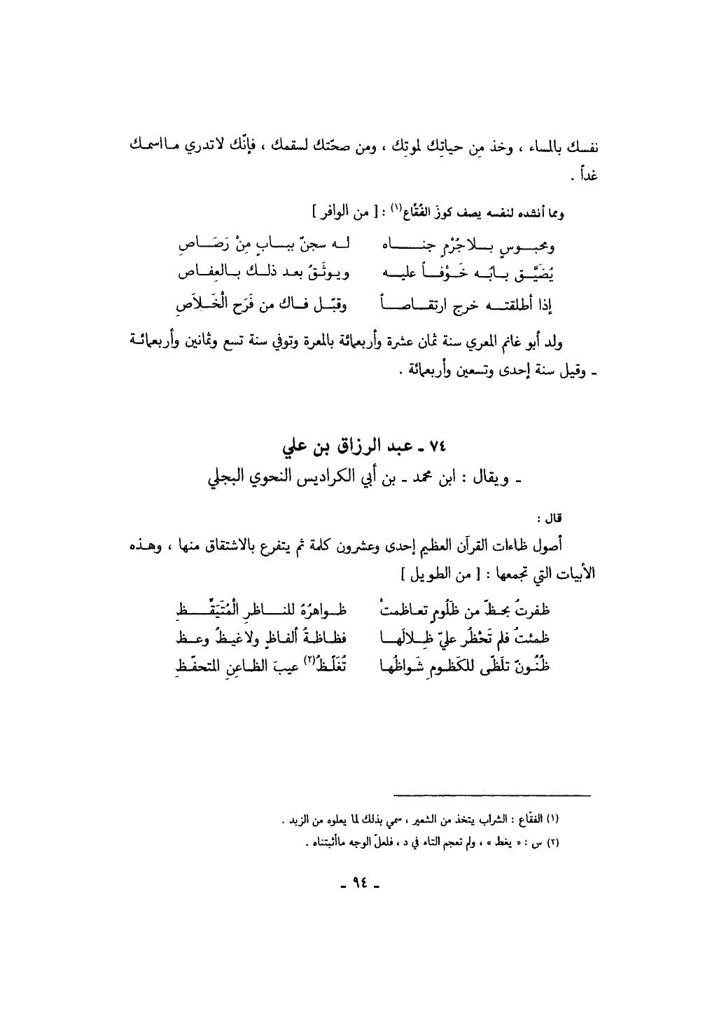 ويقال: ابن محمد بن أبي الكراديس النحوي البجلي قال: أصول ظاءات القرآن العظيم إحدى وعشرون كلمة ثم يتفرع بالاشتقاق منها، وهذه الأبيات التي تجمعها: من الطويل