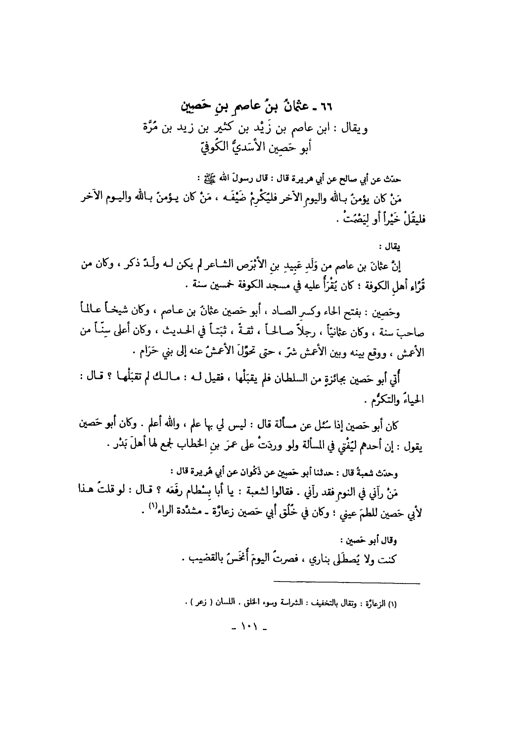وحصين: بفتح الحاء وكسر الصاد، أبو حصين عثمان بن عاصم، وكان شيخاً عالماً صاحب سنة، وكان عثمانياً، رجلاً صالحاً، ثقة، ثبتاً في الحديث، وكان أعلى سناً من الأعمش، ووقع بينه وبين الأعمش شر، حتى تحول الأعمش عنه إلى بني حرام.