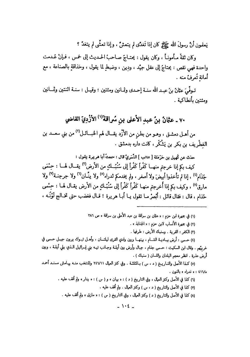 حدث عن كهيل بن حرملة النمري قال: سمعت أبا هريرة يقول: كيف بكم إذا خرجتم منها كفراً كفراً إلى سنبك من الأرض يقال لها: حسمى جذام، إذا لم تأخذوا أبيض ولا أصفر، ولم يخدمكم ثدراء لا ينان ولا جرجنة ولا مارق، وكيف بكم إذا أخرجتم منها كفراً كفراً إلى سنبك من الأرض يقال لها: حسمى حذام، قال: فقال قائل: أبصر ما تقول يا أبا هريرة! قال فغضب حتى تخالج لونه،