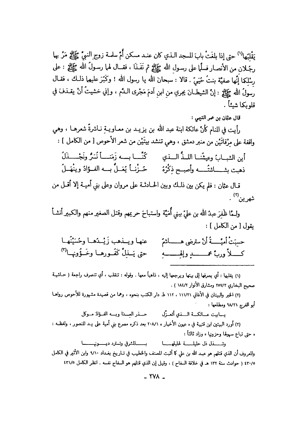 قال عثمان بن عمر التيمي: رأيت في المنام كأن عاتكة ابنة عبد الله بن يزيد بن معاوية ناشرة شعرها، وهي واقفة على مرقاتين من منبر دمشق، وهي تنشد بيتين من شعر الأحوص: من الكامل: