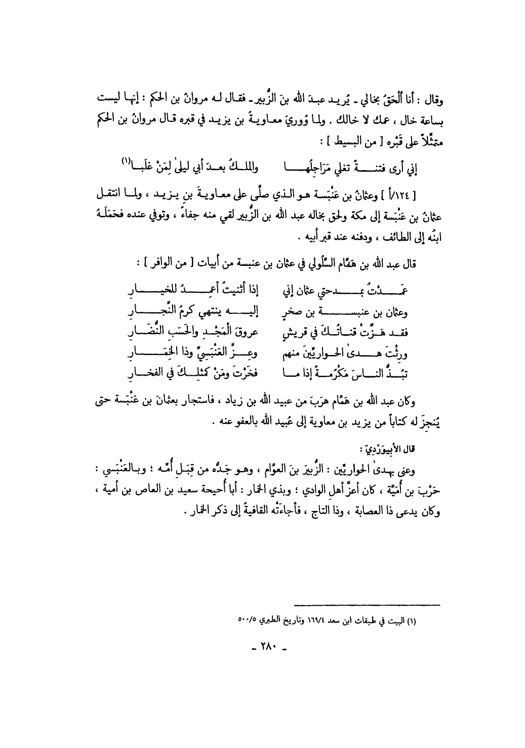 قال الأبيوردي: وعنى بهدى الحواريين: الزبير بن العوام، وهو جده من قبل أمه، وبالعنبسي: حرب بن أمية، كان أعز أهل الوادي، وبذي الخمار: أبا أحيحة سعيد بن العاص بن أمية، وكان يدعى ذا العصابة، وذا التاج، فأجاءته القافية إلى ذكر الخمار.