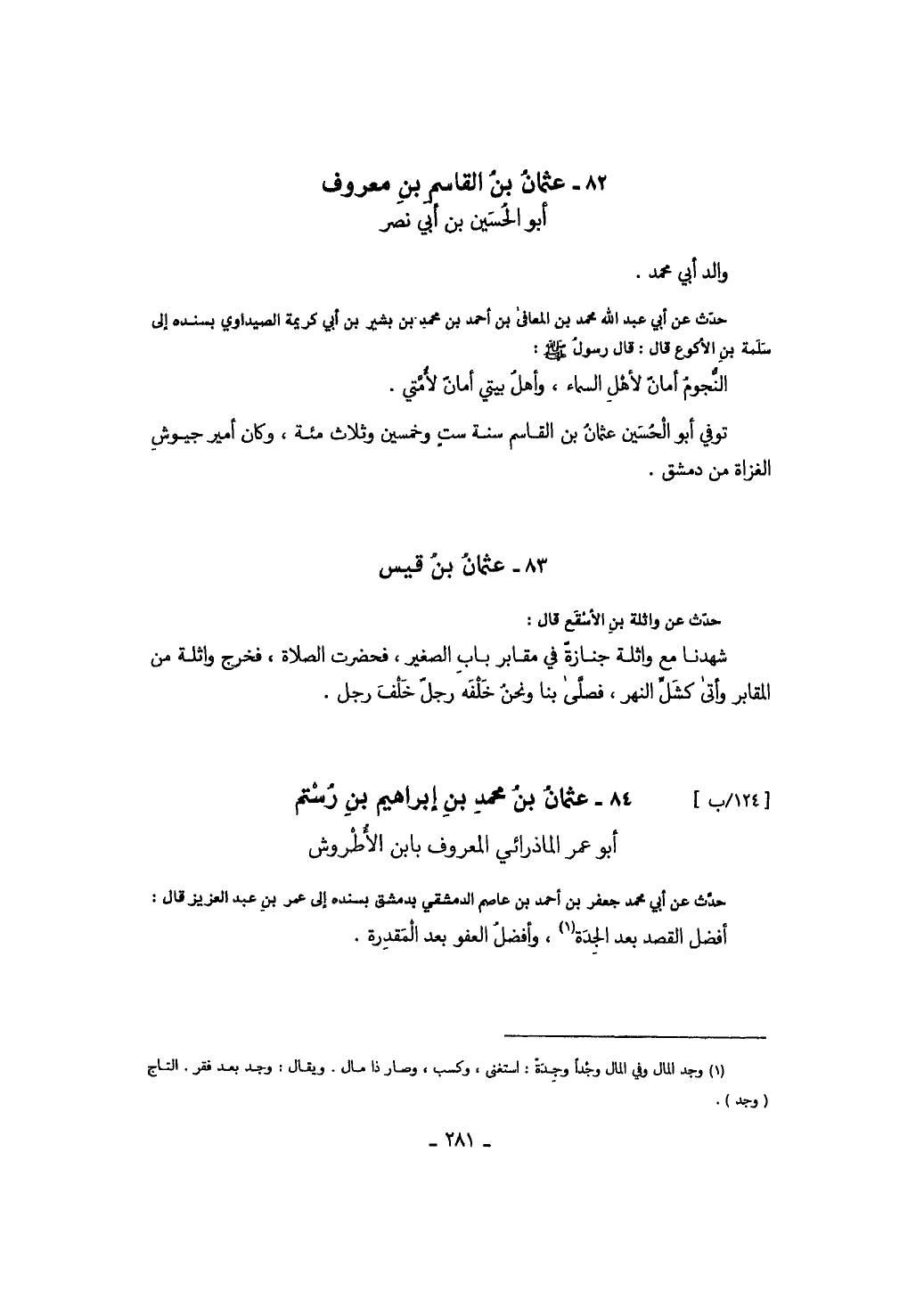 حدث عن أبي عبد الله محمد بن المعافى بن أحمد بن محمد بن بشير بن أبي كريمة الصيداوي بسنده إلى سلمة بن الأكوع قال: قال رسول الله صَلَّى اللهُ عَلَيْهِ وَسَلَّمَ: " النجوم أمان لأهل السماء، وأهل بيتي أمان لأمتي ".