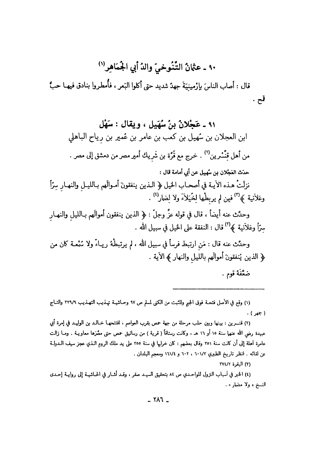 حدث العجلان بن سهيل عن أبي أمامة قال: نزلت هذه الآية في أصحاب الخيل " الذين ينفقون أموالهم بالليل والنهار سراً وعلانية " فيمن لم يربطها لخيلاء ولا لضمار.