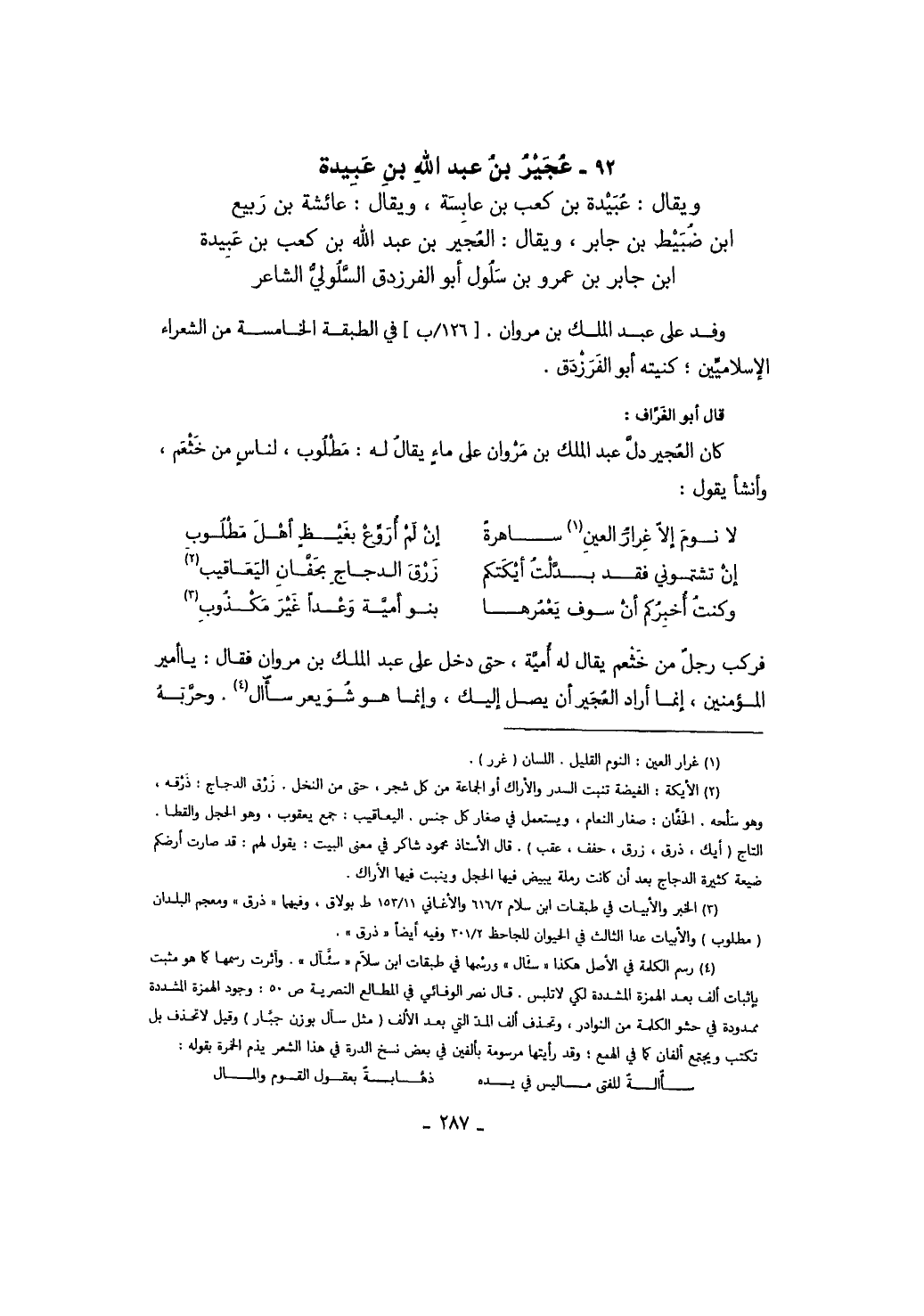 ويقال: عبيدة بن كعب بن عابسة، ويقال: عائشة بن ربيع ابن ضبيط بن جابر، ويقال: العجير بن عبد الله بن كعب بن عبيدة ابن جابر بن عمرو بن سلول أبو الفرزدق السلولي الشاعر وفد على عبد الملك بن مروان. في الطبقة الخامسة من الشعراء الإسلاميين، كنيته أبو الفرزدق.