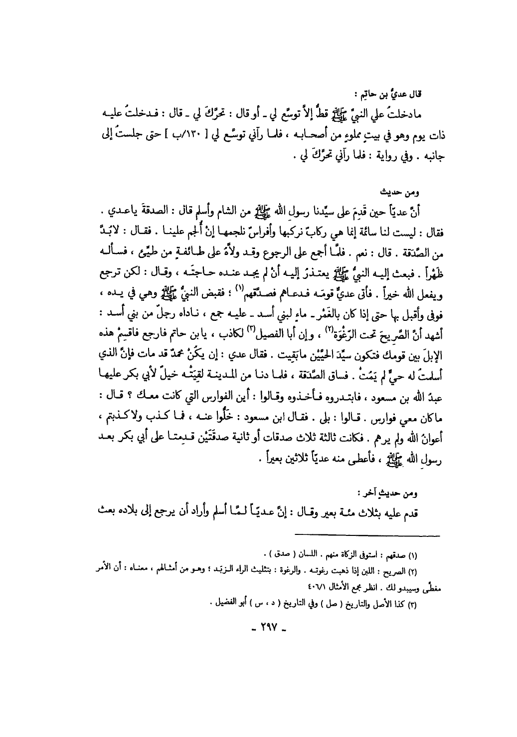 ومن حديث: أن عدياً حين قدم على سيدنا رسول الله صَلَّى اللهُ عَلَيْهِ وَسَلَّمَ من الشام وأسلم قال: الصدقة يا عدي. فقال: ليست لنا سائمة إنما هي ركاب نركبها وأفراس نلجمها إن ألجم علينا. فقال: لابد من الصدقة. قال: نعم. فلما أجمع على الرجوع وقد ولاه على طائفة من طيئ، فسأله ظهراً. فبعث إليه النبي صَلَّى اللهُ عَلَيْهِ وَسَلَّمَ يعتذر إليه أن لم يجد عنده حاجته، وقال: لكن ترجع ويفعل الله خيراً. فأتى عدي قومه فدعاهم فصدقهم، فقبض النبي صَلَّى اللهُ عَلَيْهِ وَسَلَّمَ وهي في يده، فوفى وأقبل بها إذا كان بالغمر ماء لبني أسد عليه جمع، ناداه رجل من بني أسد أشهد أن الصريح تحت الرغوة، وإن أبا الفضل لكاذب، يا بن حاتم فارجع فاقسم هذه الإبل بين قومك فتكون سيد الحيين ما بقيت. فقال عدي: إن يكن محمد قد مات فإن الذي أسلمت له حي لم يمت. فساق الصدقة، فلما دنا من المدينة لقيته خيل لأبي بكر عليها عبد الله بن مسعود، فابتدروه فأخذوه وقالوا: أين الفوارس التي كانت معك؟ قال: ما كان معي فوارس. قالوا: بلى. فقال ابن مسعود: خلوا عنه، فما كذب ولا كذبتم، أعوان الله ولم يرهم. فكانت ثالثة ثلاث صدقات أو ثانية صدقتين قدمتا على أبي بكر بعد رسول الله صَلَّى اللهُ عَلَيْهِ وَسَلَّمَ، فأعطى منه عدياً ثلاثين بعيراً.