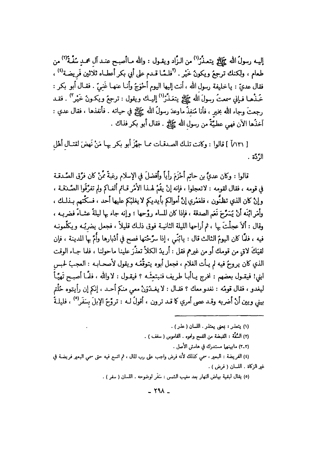 إليه رسول الله صَلَّى اللهُ عَلَيْهِ وَسَلَّمَ يتعذر من الزاد ويقول: والله ما أصبح عند آل محمد سفة من طعام، ولكنك ترجع ويكون خير. فلما قدم على أبي بكر أعطاه ثلاثين فريضة، فقال عدي: يا خليفة رسول الله، أنت اليوم أحوج وأنا عنها غني. فقال أبو بكر: خذها فإني سمعت رسول الله صَلَّى اللهُ عَلَيْهِ وَسَلَّمَ يتعذر إليك ويقول: ترجع ويكون خير. فقد رجعت وجاء الله بخير، فأنا منفذ ما وعد رسول الله صَلَّى اللهُ عَلَيْهِ وَسَلَّمَ في حياته. فأنفذها، فقال عدي: آخذها الآن فهي عطية من رسول الله صَلَّى اللهُ عَلَيْهِ وَسَلَّمَ. فقال أبو بكر فذاك.