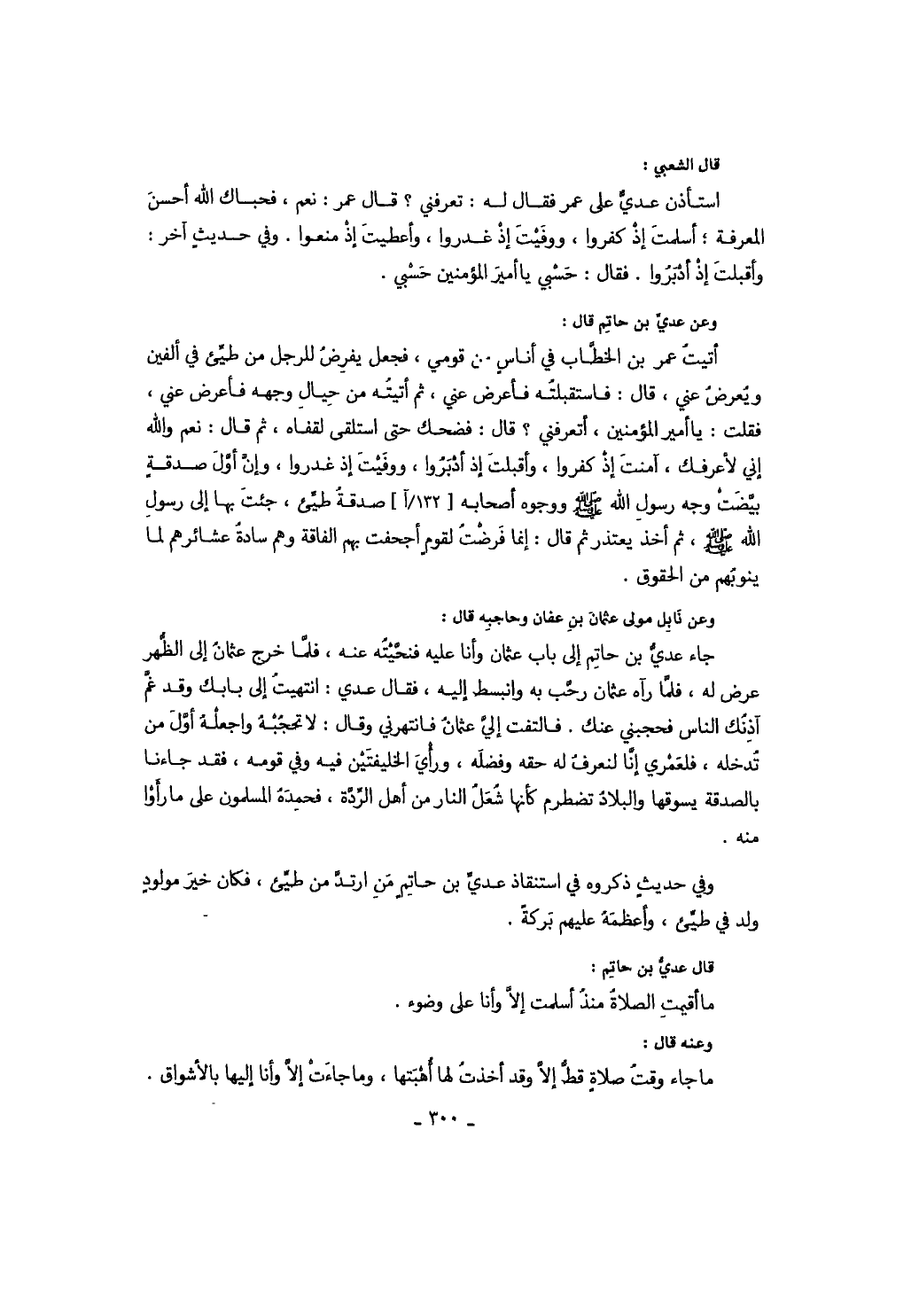 وعن عدي بن حاتم قال: أتيت عمر بن الخطاب في أناس من قومي، فجعل يفرض للرجل من طيئ في ألفين ويعرض عني، قال: فاستقبلته فأعرض عني، ثم أتيته من حيال وجهه فأعرض عني، فقلت: يا أمير المؤمنين، أتعرفني؟ قال: فضحك حتى استلقى لقفاه، ثم قال: نعم والله إني لأعرفك، آمنت إذ كفروا، وأقبلت إذ أدبروا، ووفيت إذ غدروا، وإن أول صدقة بيضت وجه رسول الله صَلَّى اللهُ عَلَيْهِ وَسَلَّمَ صدقة طيئ، جئت بها رسول الله صَلَّى اللهُ عَلَيْهِ وَسَلَّمَ، ثم أخذ يعتذر ثم قال: إنما فرضت لقوم أجحفت بهم الفاقة وهم سادة عشائرهم لما ينوبهم من الحقوق.