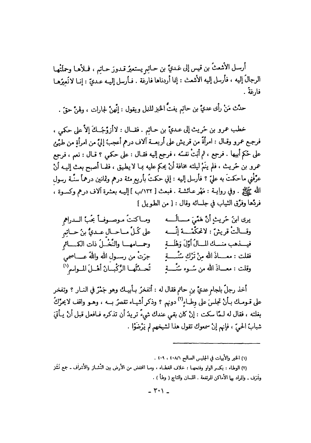 خطب عمرو بن حريث إلى عدي بن حاتم. فقال: لا أزوجك إلا على حكمي، فرجع عمرو وقال: امرأة من قريش على أربعة آلاف درهم أعجب إلي من امرأة من طيئ على حكم أبيها. فرجع، ثم أبت نفسه، فرجع إليه فقال: على حكمي؟ قال: نعم، فرجع عمرو بن حريث، فلم ينم ليلته مخافة أن يحكم عليه بما لا يطيق، فلما أصبح بعث إليه أن عرفني ما حكمت به علي؟ فأرسل إليه: إني حكمت بأربع مئة درهم وثمانين درهماً سنة رسول الله صَلَّى اللهُ عَلَيْهِ وَسَلَّمَ. وفي رواية: مهر عائشة. فبعث إليه بعشرة آلاف درهم وكسوة، فردها وفرق الثياب في جلسائه وقال: من الطويل: