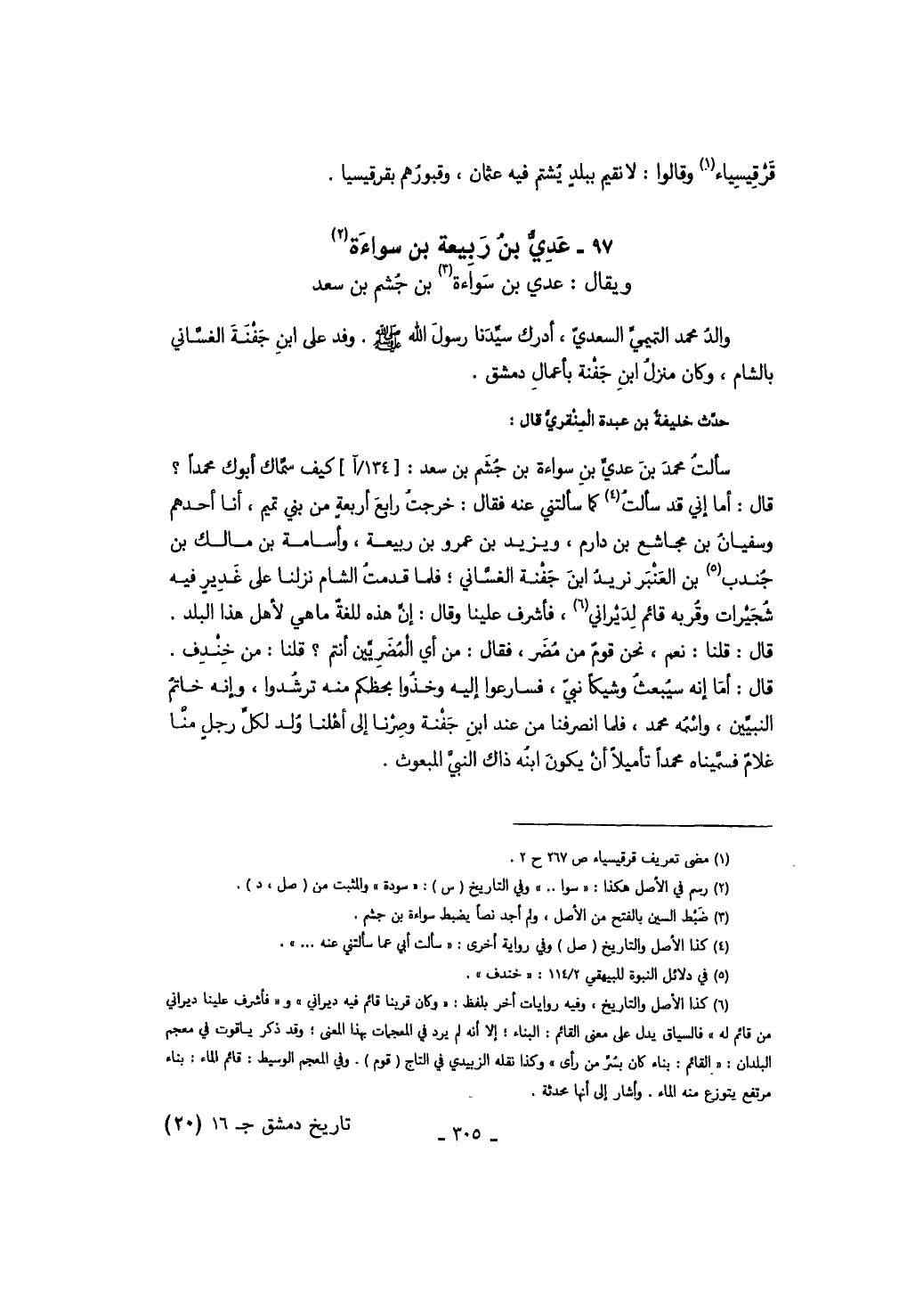 حدث خليفة بن عبدة المنقري قال: سألت محمد بن عدي بن سواءة بن جشم بن سعد: كيف سماك أبوك محمداً؟ قال: أما إني قد سألت كما سألتني عنه فقال: خرجت رابع أربعة من بني تميم، أنا أحدهم وسفيان بن مجاشع بن دارم، ويزيد بن عمرو بن ربيعة، وأسامة بن مالك بن جندب بن العنبر نريد ابن جفنة الغساني، فلما قدمت الشام نزلنا على غدير فيه شجيرات وقربه قائم لديراني، فأشرف علينا وقال: إن هذه للغة ما هي لأهل هذا البلد. قال: قلنا: نعم، نحن قوم من مضر، فقال: من أي المضريين أنتم؟ قلنا: من خندق. قال: أما إنه سيبعث وشيكاً نبي، فسارعوا إليه وخذوا بحظكم منه ترشدوا، وإنه خاتم النبيين، واسمه محمد، فلما انصرفنا من عند ابن جفنة وصرنا إلى أهلنا ولد لكل رجل منا غلام فسميناه محمداً تأميلاً أن يكون ابنه ذاك النبي المبعوث.