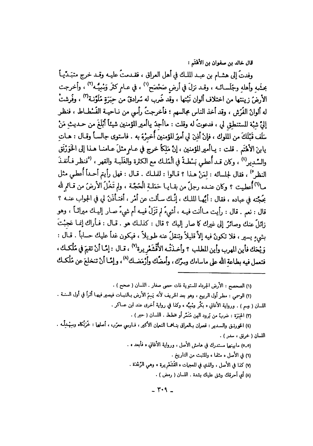 قال خالد بن صفوان بن الأهتم: وفدت إلى هشام بن عبد الملك في أهل العراق، فقدمت عليه وقد خرج مبتدياً بحشمه وأهله وجلسائه، وقد نزل في أرض صحصح، في عام كثر وسميه، وأخرجت الأرض زينتها من اختلاف ألوان نبتها، وقد ضرب له سرادق من حبرة ملونة، وقد فرشت له ألوان الفرش، وقد أخذ الناس مجالسهم، فأخرجت رأسي من ناحية الفسطاط، فنظر إلي شبه المستنطق لي، فدعوت له وقلت: ما أجد يا أمير المؤمنين شيئاً أبلغ من حديث من سلف قبلك من الملوك، فإن أذن لي أمير المؤمنين أخبره به. فاستوى جالساً وقال: هات يا بن الأهتم. قلت: يا أمير المؤمنين، إن ملكاً خرج في عام مثل عامنا هذا إلى الخورنق والسدير، وكان قد أعطي بسطة في الملك مع الكثرة والغلبة والقهر، فنظر فأنفذ النظر، فقال لجلسائه: لمن هذا؟ قالوا: للملك. قال: فهل رأيتم أحد أعطي مثل ما أعطيت؟ وكان عنده رجل من بقايا حملة الحجة، ولم تخل الأرض من قائم لله بحجته في عباده، فقال: رأيت ما أنت فيه، أشيء لم تزل فيه أم شيء صار إليك ميراثاً، وهو زائل عنك وصائر إلى غيرك كما صار إليك؟ قال: كذلك هو. قال: فأراك إنما عجبت بشيء يسير، فلا تكون فيه إلا قليلاً وتنقل طويلاً، فيكون غداً عليك حساباً. قال: ويحك فأين المهرب وأين المطلب؟ وأخذته الأقشعريرة، قال: إما أن تقيم في ملكك، فتعمل فيه بطاعة الله على ما ساءك وسرك، وأمضك وأرمضك، وإما أن تنخلع عن ملكك