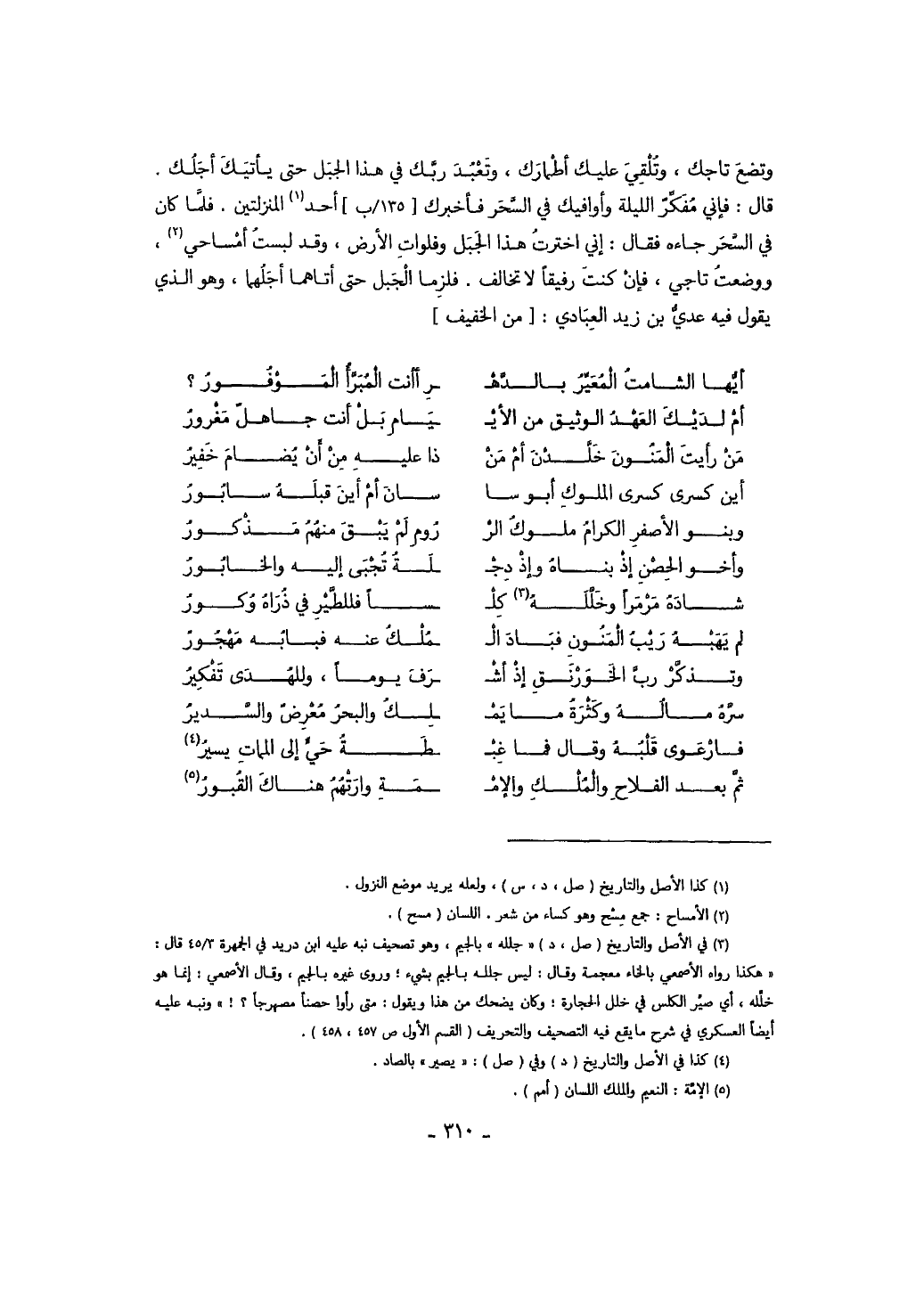 وتضع تاجك، وتلقي عليك أطمارك، وتعبد ربك في هذا الجبل حتى يأتيك أجلك. قال: فإني مفكر الليلة وأوافيك في السحر فأخبرك أحد المنزلتين. فلما كان في السحر جاءه فقال: إني اخترت هذا الجبل وفلوات الأرض، وقد لبست أمساحي، ووضعت تاجي، فإن كنت رفيقاً لا تخالف، فلزمنا الحبل حتى أتاهما أجلهما، وهو الذي يقول فيه عدي بن زيد العبادي: من الخفيف: