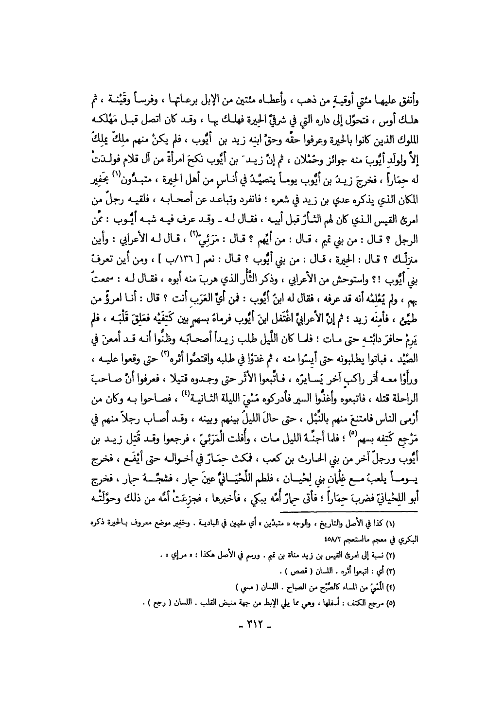 وأنفق عليها مئتي أوقية من ذهب، وأعطاه مئتين من الإبل برعاتها، وفرساً وقينة، ثم هلك أوس، فتحول إلى داره التي في شرقي الحيرة فهلك بها، وقد كان اتصل قبل مهلكه الملوك الذين كانوا بالحيرة وعرفوا حقه وحق ابنه زيد بن أيوب، فلم يكن منهم ملك يملك إلا ولولد أيوب منه جوائز وحملان، ثم إن زيد بن أيوب نكح امرأة من آل قلام فولدت له حماراً، فخرج زيد بن أيوب يوماً يتصيد في أناس من أهل الحيرة، متبدون بحفير المكان الذي يذكره عدي بن زيد في شعره، فانفرد وتباعد عن أصحابه، فلقيه رجل من امرئ القيس الذي كان لهم الثأر قبل أبيه، فقال له وقد عرف فيه شبه أيوب: ممن الرجل؟ قال: من بني تميم، قال: من أيهم؟ قال: مرئي، قال له الأعرابي: وأين منزلك؟ قال: الحيرة، قال: من بني أيوب؟ قال: نعم، ومن أين تعرف بني أيوب؟! واستوحش من الأعرابي، وذكر الثأر الذي هرب منه أبوه، فقال له: سمعت بهم، ولم يعلمه أنه قد عرفه، فقال له ابن أيوب: فمن أي العرب أنت؟ قال: أنا امرؤ من طيئ، فأمنه زيد، ثم إن الأعرابي اغتفل ابن أيوب فرماه بسهم بين كتفيه فعلق قلبه، فلم يرم حافر دابته حتى مات، فلما كان الليل طلب زيداً أصحابه وظنوا أنه قد أمعن في الصيد، فباتوا يطلبونه حتى أيسوا منه، ثم غدوا في طلبه واقتصوا أثره حتى وقعوا عليه، ورأوا معه أثر راكب آخر يسايره، فاتبعوا الأثر حتى وجدوه قتيلاً، فعرفوا أن صاحب الراحلة قتله، فاتبعوه وأغذوا السير فأدركوه مسي الليلة الثانية، فصاحوا به وكان من أرمى الناس فامتنع منهم بالنيل، حتى حال الليل بينهم وبينه، وقد أصاب رجلاً منهم في مرجع كتفه بسهم، فلما أجنه الليل مات، وأفلت المرئي، فرجعوا وقد قتل زيد بن أيوب ورجل آخر من بني الحارث بن كعب، فمكث حمار في أخواله حتى أيفع، فخرج يوماً يلعب مع غلمانه بني لحيان، فلطم اللحياني عين الحمار، فشجه حمار، فخرج أبو اللحياني فضرب حماراً، فأتى أمه يبكي، فأخبرها، فجزعت أمه من ذلك وحولته