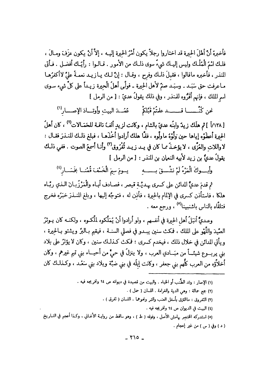 فأخبروه أن أهل الحيرة قد اختاروا رجلاً يكون أمر الحيرة إليه، إلا أن يكون عزف ومال، فلك اسم الملك وليس إليك شيء سوى ذلك من الأمور. قالوا: رأيك أفضل. فأتى المنذر، فأخبره ما قالوا، فقبل ذلك وفرح، وقال: إن لك يا زيد نعمة علي لا أكفرها ما عرفت حق سبد وسبد صنم لأهل الحيرة فولى أهل الحيرة زيداً على كل شيء سوى اسم الملك، فإنهم أقروه للمنذر، وفي ذلك يقول عدي: من الرمل: