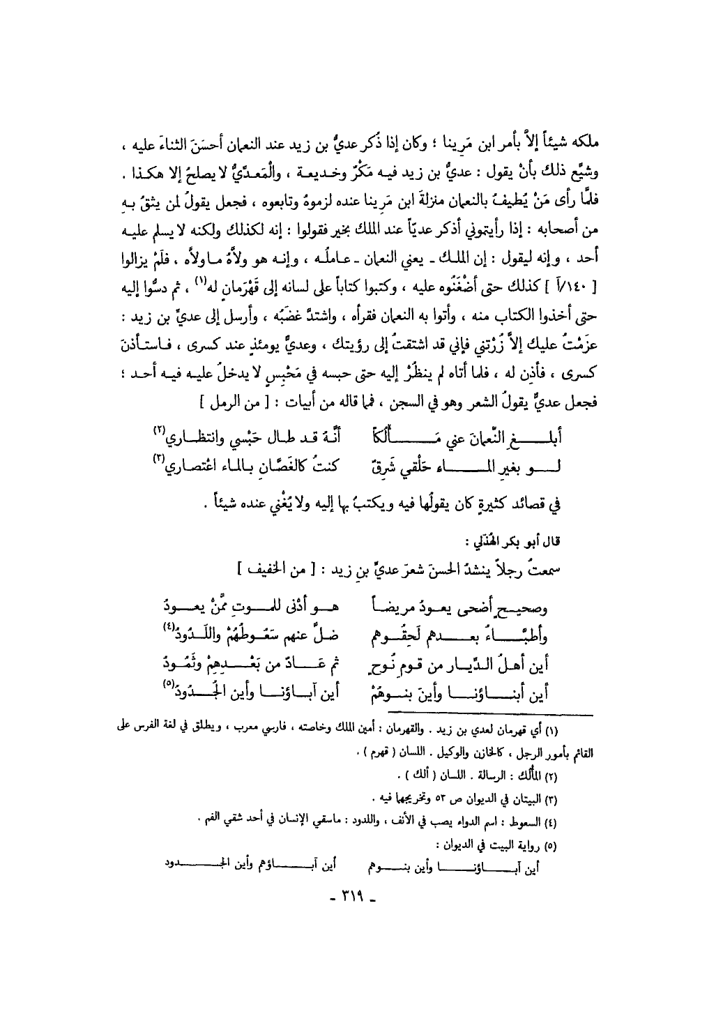 ملكه شيئاً إلا بأمر ابن مرينا، وكان إذا ذكر عدي بن زيد عند النعمان أحسن الثناء عليه وشيع ذلك بأن يقول: عدي بن زيد فيه مكر وخديعة، والمعدي لا يصلح إلا هكذا. فلما رأى من يطيف بالنعمان منزلة ابن مرينا عنده لزموه وتابعوه، فجعل يقول لمن يثق به من أصحابه: إذا رأيتموني أذكر عدياً عند الملك بخير فقولوا: إنه لكذلك ولكنه لا يسلم عليه من أصحابه أحد، وإنه ليقول: إن الملك يعني النعمان عامله، وإنه هو ولاه ما ولاه، فلم يزالوا كذلك حتى أضغنوه عليه، وكتبوا كتاباً على لسانه إلى قهرمان له، ثم دسوا إليه حتى أخذوا الكتاب منه، وأتوا به النعمان فقرأه، واشتد غضبه، وأرسل إلى عدي بن يزيد: عزمت عليك إلا زرتني فإني قد اشتقت إلى رؤيتك، وعدي يومئذ عند كسرى، فاستأذن كسرى، فأذن له، فلما أتاهلم ينظر إليه حتىحبسه في محبس لا يدخل عليه فيه أحد، فجعل عدي يقول الشعر وهو في السجن، فمما قاله من أبيات: من الرمل: