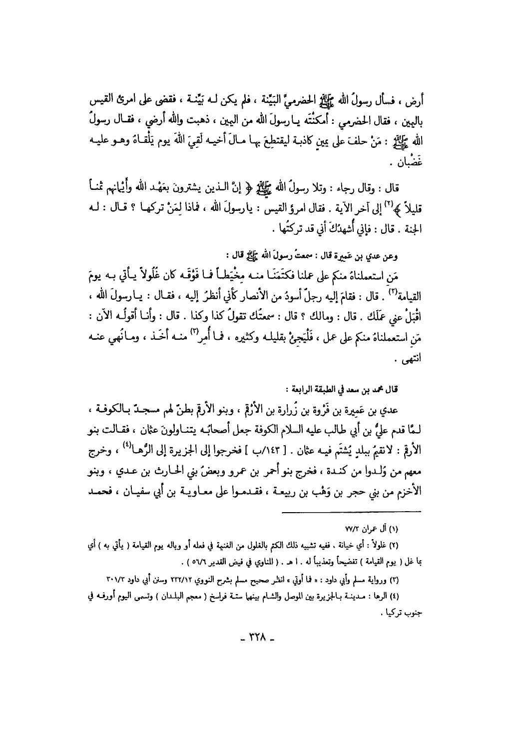 وعن عدي بن عميرة قال: سمعت رسول الله صَلَّى اللهُ عَلَيْهِ وَسَلَّمَ قال: من استعملناه منكم على عملنا فكتمنا منه مخيطاً فما فوقه كان غلولاُ يأتي به يوم القيامة. قال: فقام إليه رجل أسود من الأنصار كأني أنظر إليه، فقال: يا رسول الله، اقبل عني عملك. قال: ومالك؟ قال: سمعتك تقول كذا وكذا. قال: وأنا أقوله الآن: من استعملناه منكم على عمل، فليجئ بقليله وكثيره، فما أمر منه أخذ، وما نهي عنه انتهى.