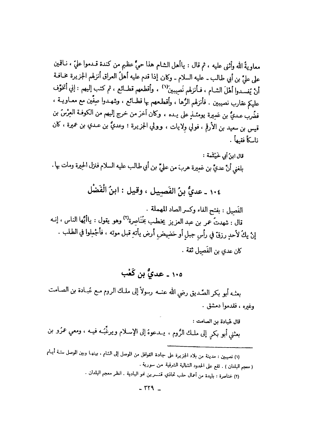 معاوية الله وأثنى عليه، ثم قال: يا أهل الشام هذا حي عظيم من كندة قدموا علي، ناقمين على علي بن أبي طالب عليه السلام وكان إذا قدم عليه أهل العراق أنزلهم الجزيرة مخافة أن يفسدوا أهل الشام، فأنزلهم نصيبين. فأنزلهم الرها، وأقطعهم قطائع، ثم كتب إليهم: إني أتخوف عليكم عقارب نصيبين. فأنزلهم الرها وأقطعهم بها قطائع، وشهدوا صفين مع معاوية، فضرب عدي بن عميرة يومئذ على يده، وكان آخر من خرج إليهم من الكوفة العرس بن قيس بن سعيد بن الأرقم، فولي ولايات، وولي الجزيرة، وعدي بن عدي بن عميرة، كان ناسكاً فقيهاً.