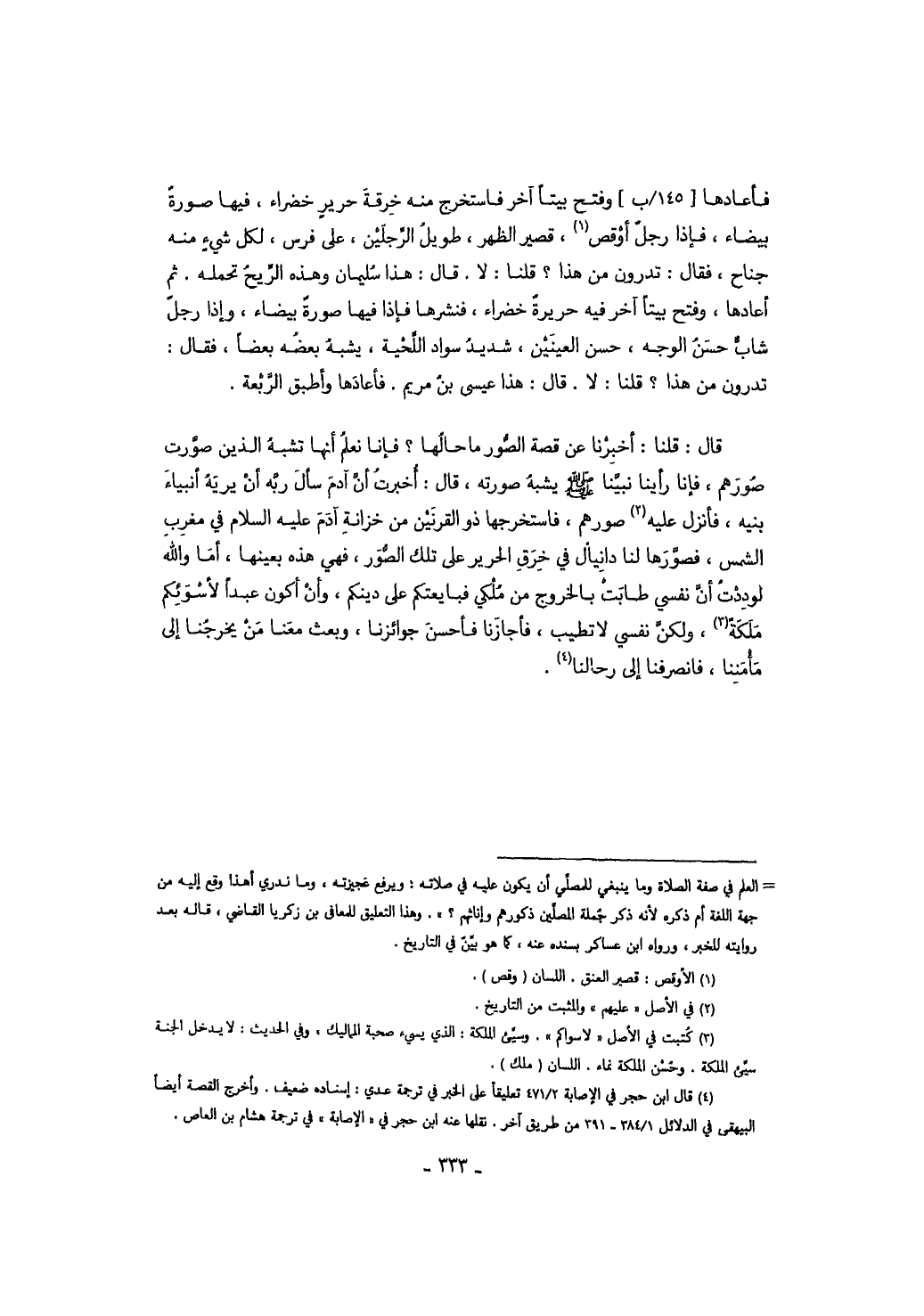 قال: قلنا: أخبرنا عن قصة الصور ما حالها؟ فإنا نعلم أنها تشبه الذين صورت صورهم، فإنا رأينا نبينا صَلَّى اللهُ عَلَيْهِ وَسَلَّمَ يشبه صورته، قال: أخبرت أن آدم سأل ربه أن يريه أنبياء نبيه فأنزل عليهم صورهم فاستخرجها ذو القرنين من خزانة آدم عليه السلام في مغرب الشمس، فصورها لنا دانيال في خرق الحرير على تلك الصور، فهي هذه بعينها، أما والله لوددت أن نفسي طابت بالخروج من ملكي فبايعتكم على دينكم، وأن أكون عبداً لأسوئكم ملكة، ولكن نفسي لا تطيب، فأجازنا فأحسن جوائزنا، وبعث معنا من يخرجنا إلى مأمننا، فانصرفنا إلى رحالنا.