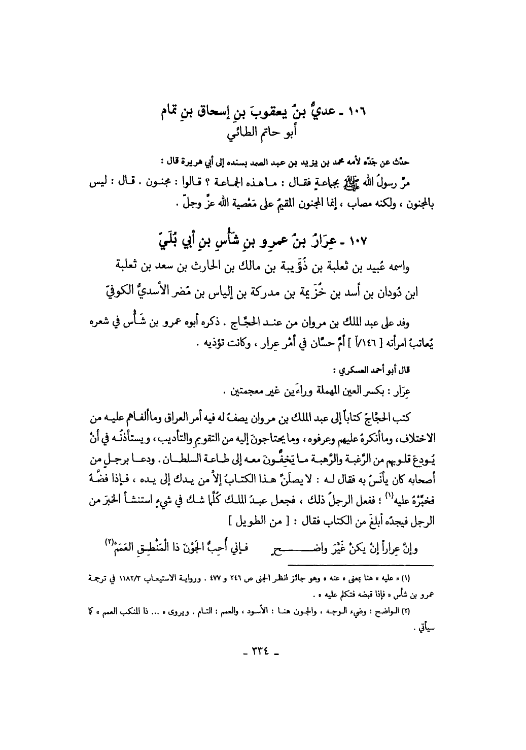 وإن عراراً إن يكن غير واضح ... فإني أحب الجون ذا المنطق العمم