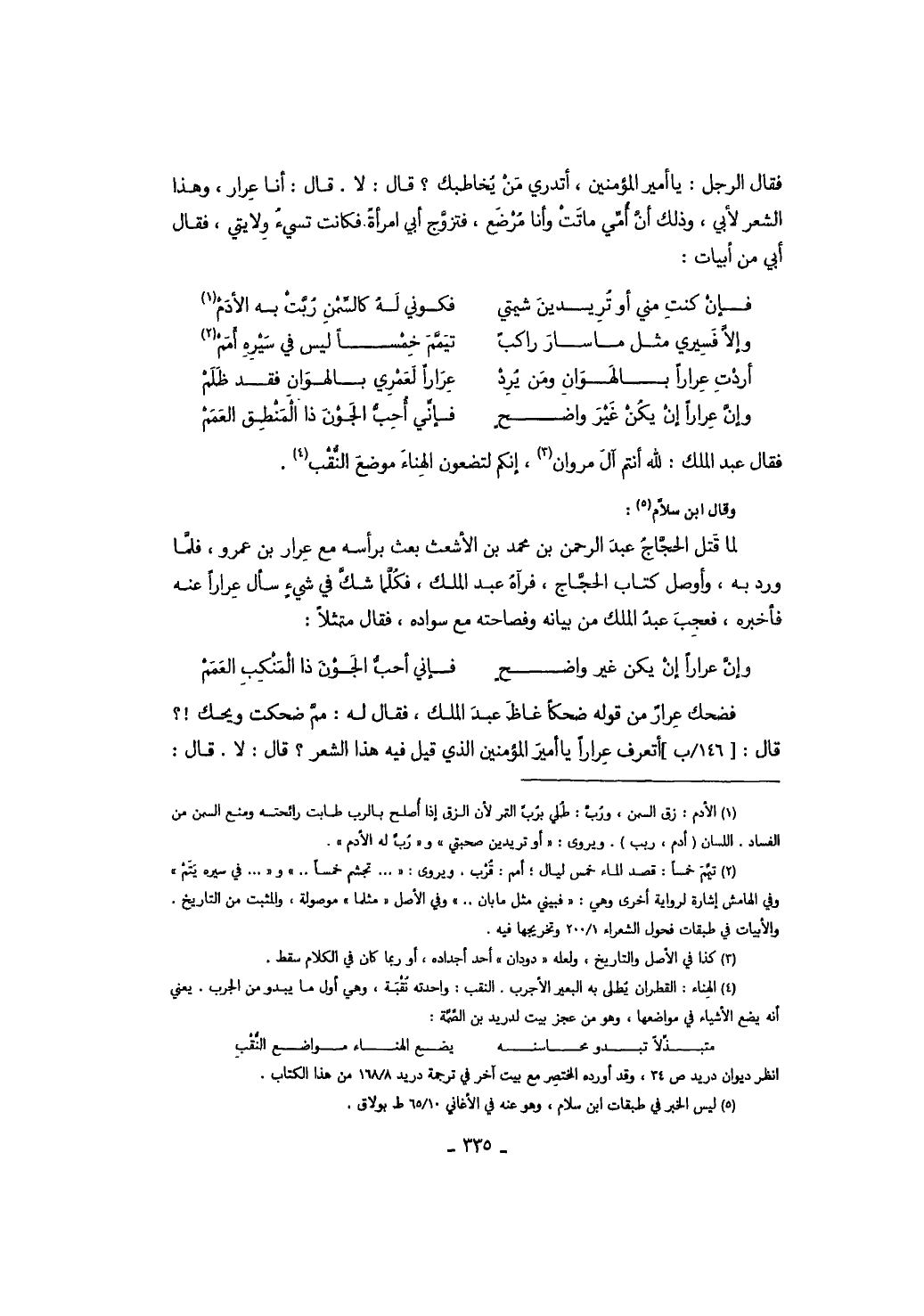فقال الرجل: يا أمير المؤمنين، أتدري من يخاطبك؟ قال: لا. قال: أنا عرار، وهذا الشعر لأبي، وذلك أن أمي ماتت وأنا مرضع، فتزوج أبي امرأة فكانت تسيء ولايتي، فقال أبي من أبيات: