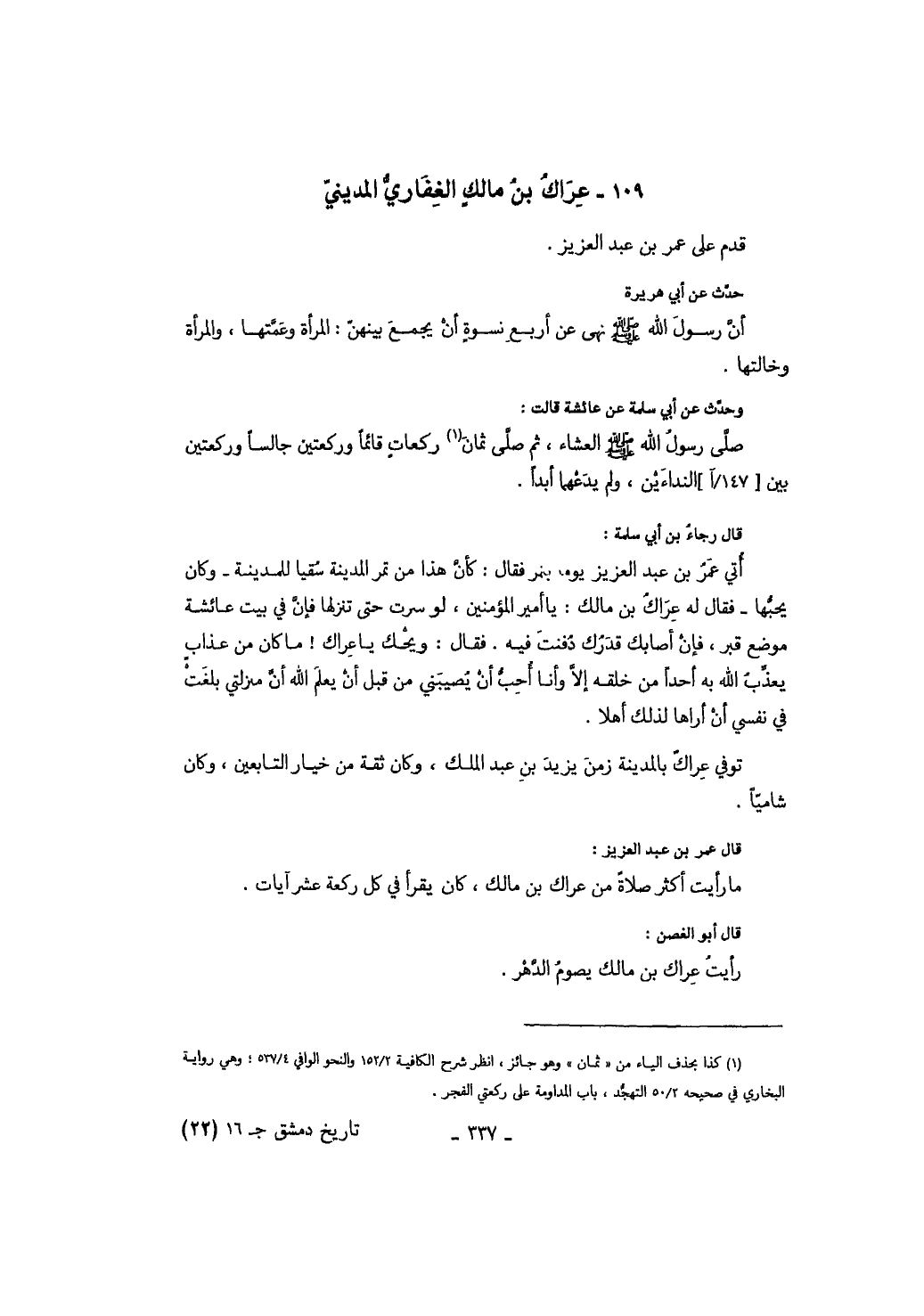 قال عمر بن عبد العزيز: ما رأيت صلاة من عراك بن مالك، كان يقرأ في كل ركعة عشر آيات.