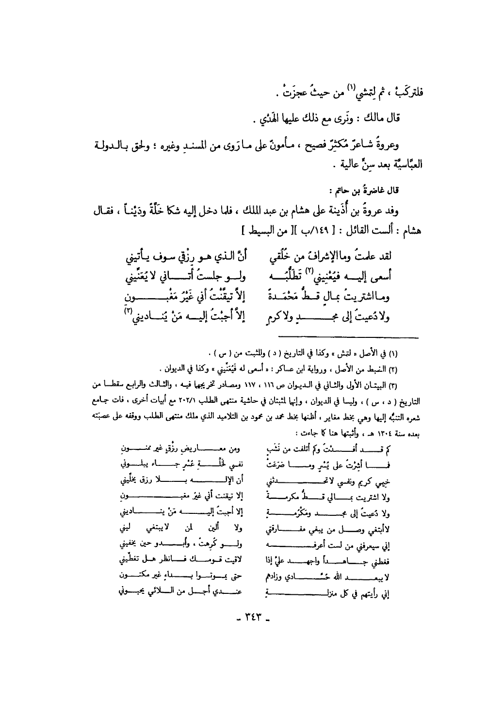 قال غاضرة بن حاتم: وفد عروة بن أذينة على هشام بن عبد الملك، فلما دخل إليه شكا خلة وديناً، فقال هشام: ألست القائل: من البسيط: