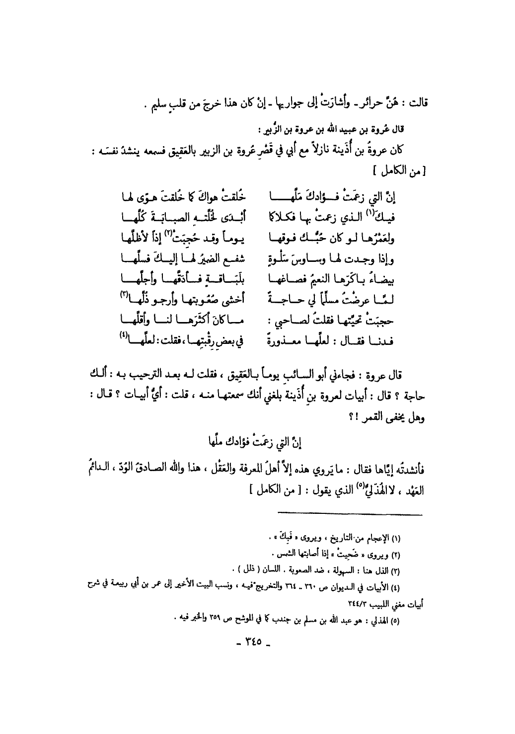 قال عروة: فجاءني أبو السائب يوماً بالعقيق، فقلت له بعد الترحيب به: ألك حاجة؟ قال: أبيات لعروة بن أذينة بلغني أنك سمعتها منه، قلت: أي أبيات؟ قال: وهل يخفى القمر؟!