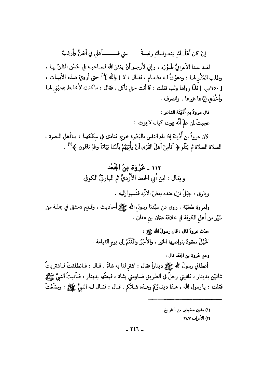 وعن عروة بن الجعد قال: أعطاني رسول الله صَلَّى اللهُ عَلَيْهِ وَسَلَّمَ ديناراً فقال: اشترلنا به شاة. قال: فانطلقت فاشتريت شاتين بدينار، فلقيني رجل في الطريق فساومني بشاة، فبعتها بدينار، فأتيت النبي صَلَّى اللهُ عَلَيْهِ وَسَلَّمَ فقلت: يا رسول الله، هذا ديناركم وهذه شاتكم. قال: فقال له النبي صَلَّى اللهُ عَلَيْهِ وَسَلَّمَ: وصنعت