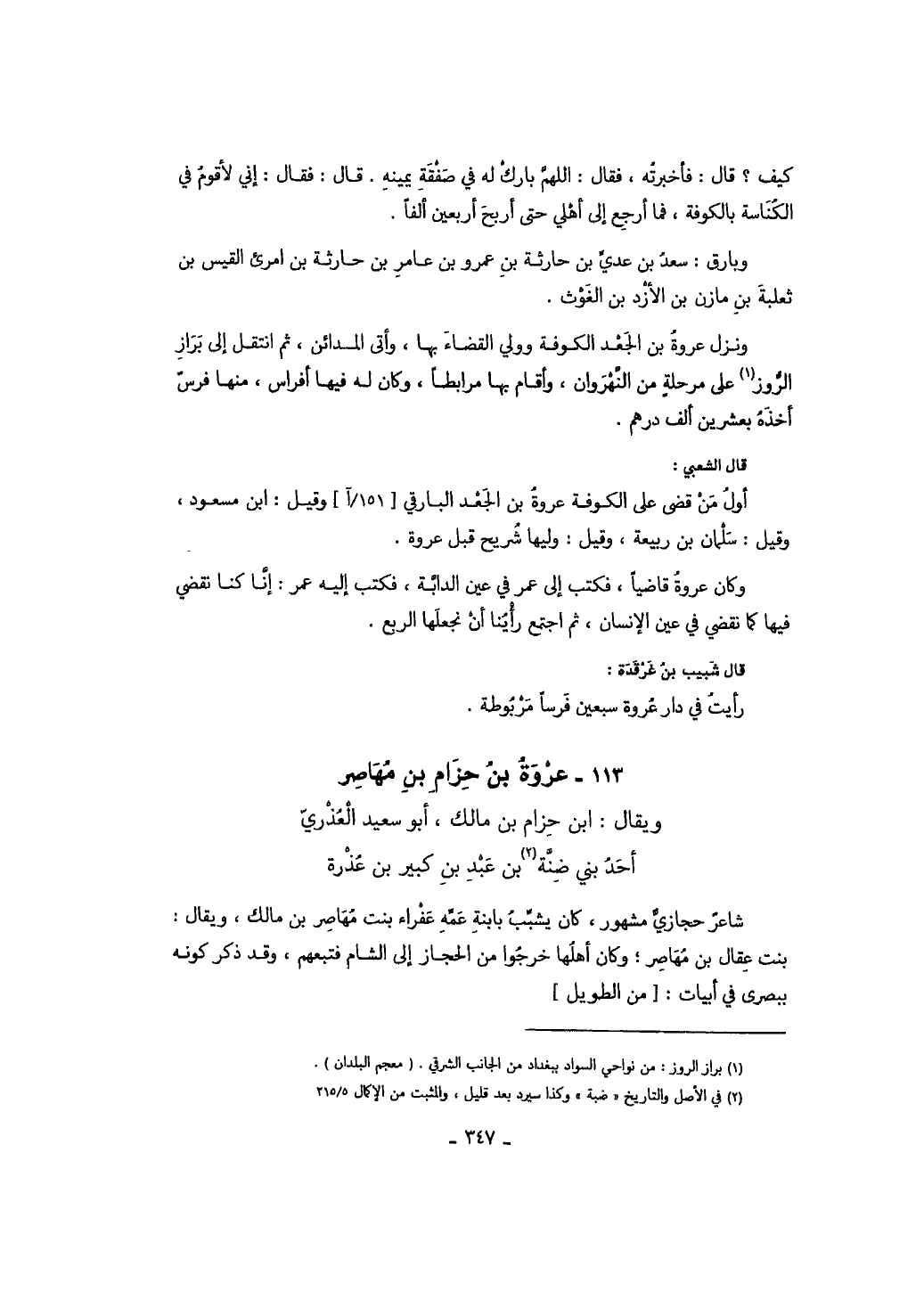 ونزل عروة بن الجعد الكوفة وولي القضاء بها، وأتى المدائن، ثم انتقل إلى براز الروز على مرحلة من النهروان، وأقام بها مرابطاً، وكان له فيها أفراس، منها فرس أخذه بعشرين ألف درهم.