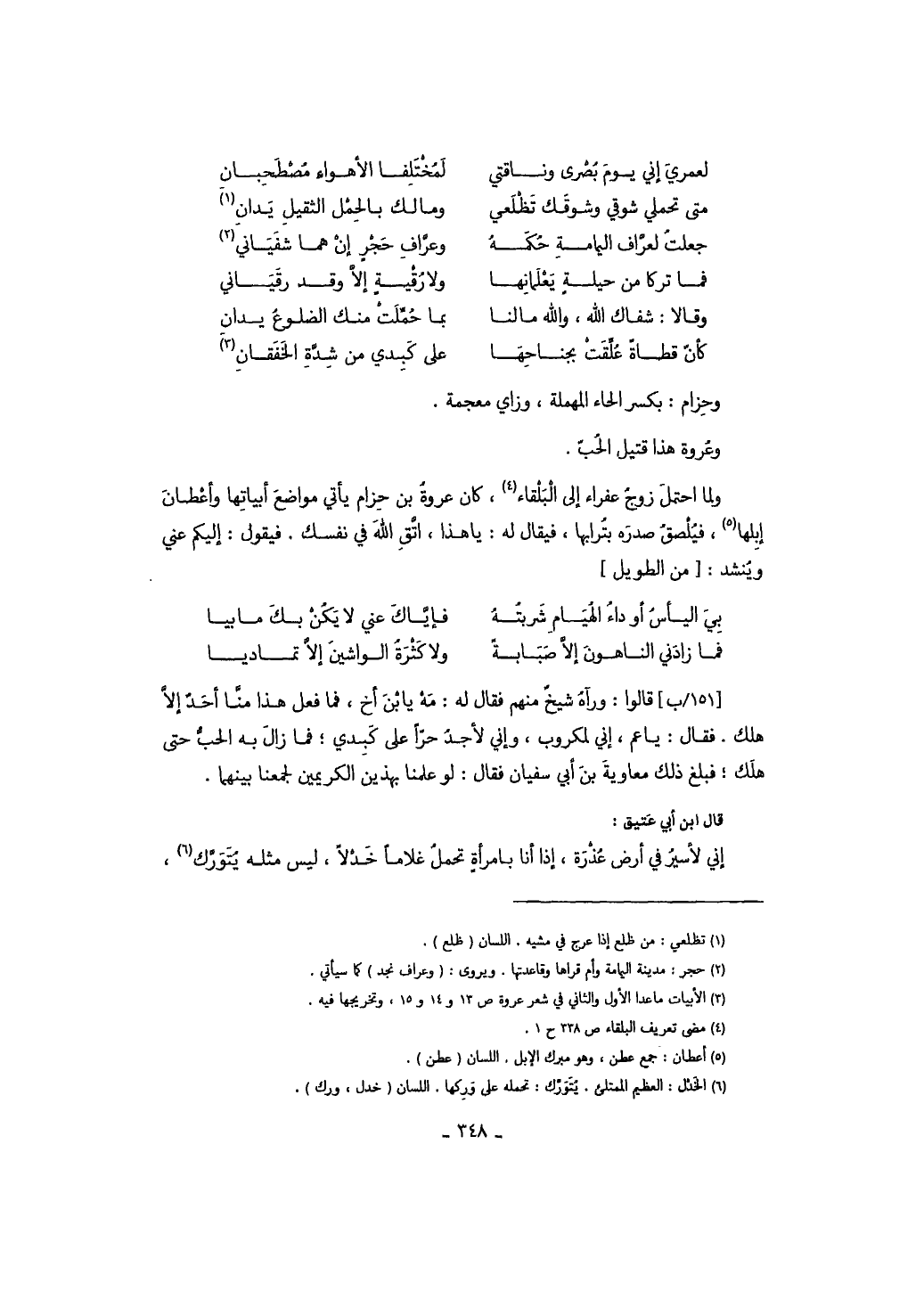 ولما احتمل زوج عفراء إلى البلقاء، كان عروة بن حزام يأتي مواضع أبياتها وأعطان إبلها، فيلصق صدره بترابها، فيقال له: يا هذا، اتق الله في نفسك. فيقول: إليكم عني وينشد: من الطويل: