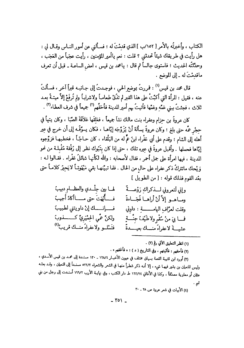 كان عروة بن حزام وعفراء بنت مالك نشأ جميعاً، فعلقها علاقة الصبا، وكان يتيماً في حجر عمه حتى بلغ، وكان عروة يسأله أن يزوجه إياها، فكان يسوفه إلى أن خرج في عير أهله إلى الشام، وقدم على أبي عفراء ابن عم له من البلقاء، كان حاجاً، فخطبها فزوجه إياها فحملها. وأقبل عروة في عيره تلك، حتى إذا كان بتبوك نظر إلى رفقة مقبلة من نحو المدينة، فيها امرأة على جمل أحمر، فقال لأصحابه: والله لكأنها شمائل عفراء. فقالوا له: ويحك ما تترك ذكر عفراء على حال من الحال. فلما تبينها بقي مبهوتاً لا يحير كلاماً حتى بعد القوم فذلك قوله: من الطويل: