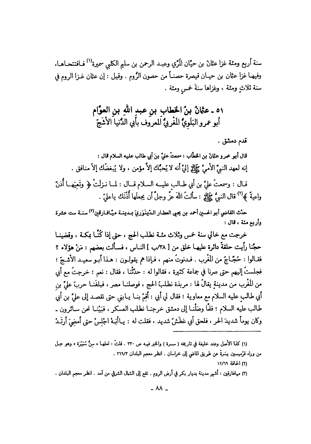 ابن العوام أبو عمرو البلوي المغربي المعروف بأبي الدنيا الأشج قدم دمشق. قال أبو عمرو عثمان بن الخطاب: سمعت علي بن أبي طالب عليه السلام قال: إنه لعهد النبي الأمي صَلَّى اللهُ عَلَيْهِ وَسَلَّمَ إلي أنه لا يحبك إلا مؤمن، ولا يبغضك إلا منافق.