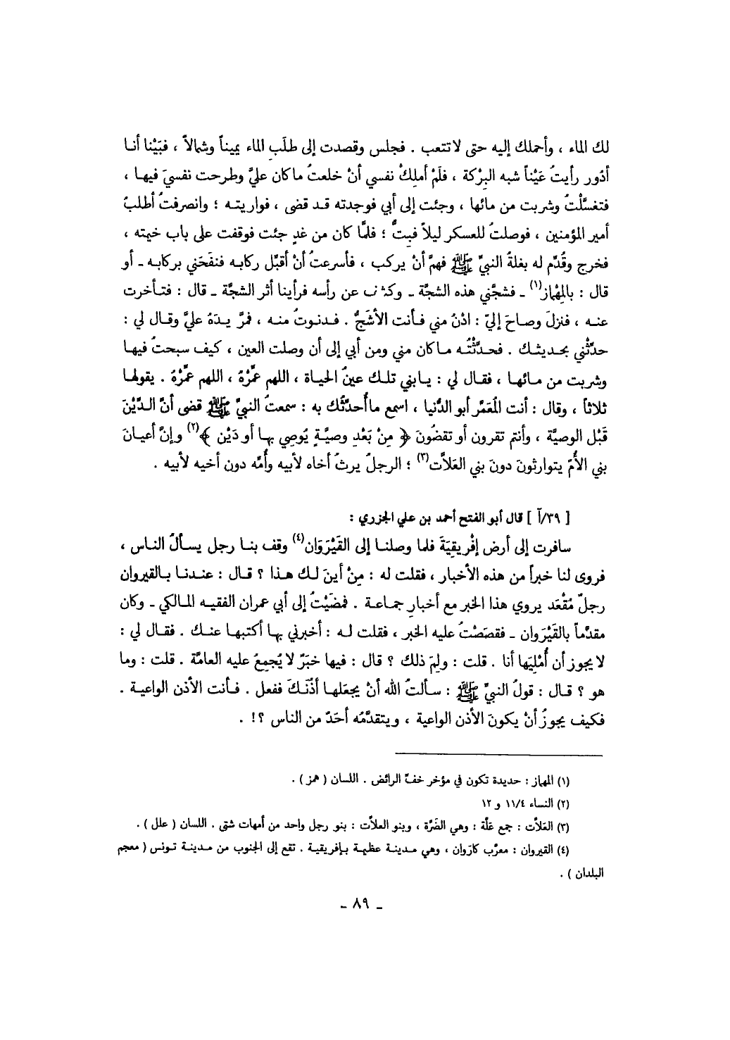 قال أبو الفتح أحمد بن علي الجزري: سافرت إلى أرض إفريقية فلما وصلنا إلى القيروان وقف بنا رجل يسأل الناس، فروى لنا خبراً ممن هذه الأخبار، فقلت له: من أين لك هذا؟ قال: عندنا بالقيروان رجل مقعد يروي هذا الخبر مع أخبار جماعة. فمضيت إلى أبي عمران الفقيه المالكي وكان مقدماً بالقيروان فقصصت عليه الخبر، فقلت له: أخبرني بها أكتبها عنك. فقال لي: لا يجوز أن أمليها أنا. قلت: ولم ذلك؟ قال: فيها خبر لا يجمع عليه العامة. قلت: وما هو؟ قال: قول النبي صَلَّى اللهُ عَلَيْهِ وَسَلَّمَ: سألت الله أن يجعلها أذنك ففعل. فأنت الأذن الواعية. فكيف يجوز أن يكون الأذن الواعية، ويتقدمه أحد من الناس؟.