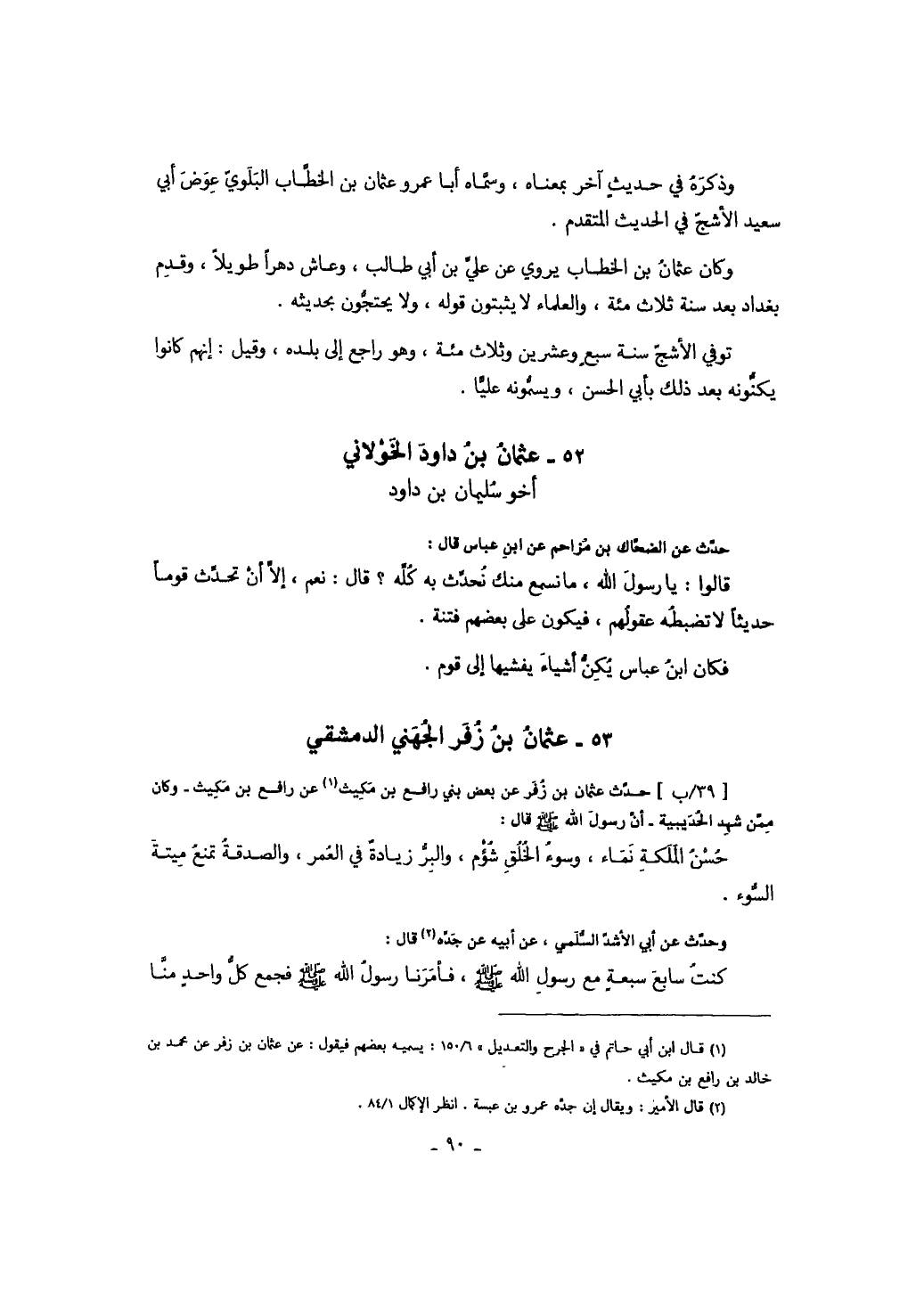 حدث عثمان بن زفر عن بعض بني رافع بن مكيث عن رافع بن مكيث وكان ممن شهد الحديبية أن رسول الله صَلَّى اللهُ عَلَيْهِ وَسَلَّمَ قال: " حسن الملكة نماء، وسوء الخلق شؤم، والبر زيادة في العمر، والصدقة تمنع ميتة السوء.