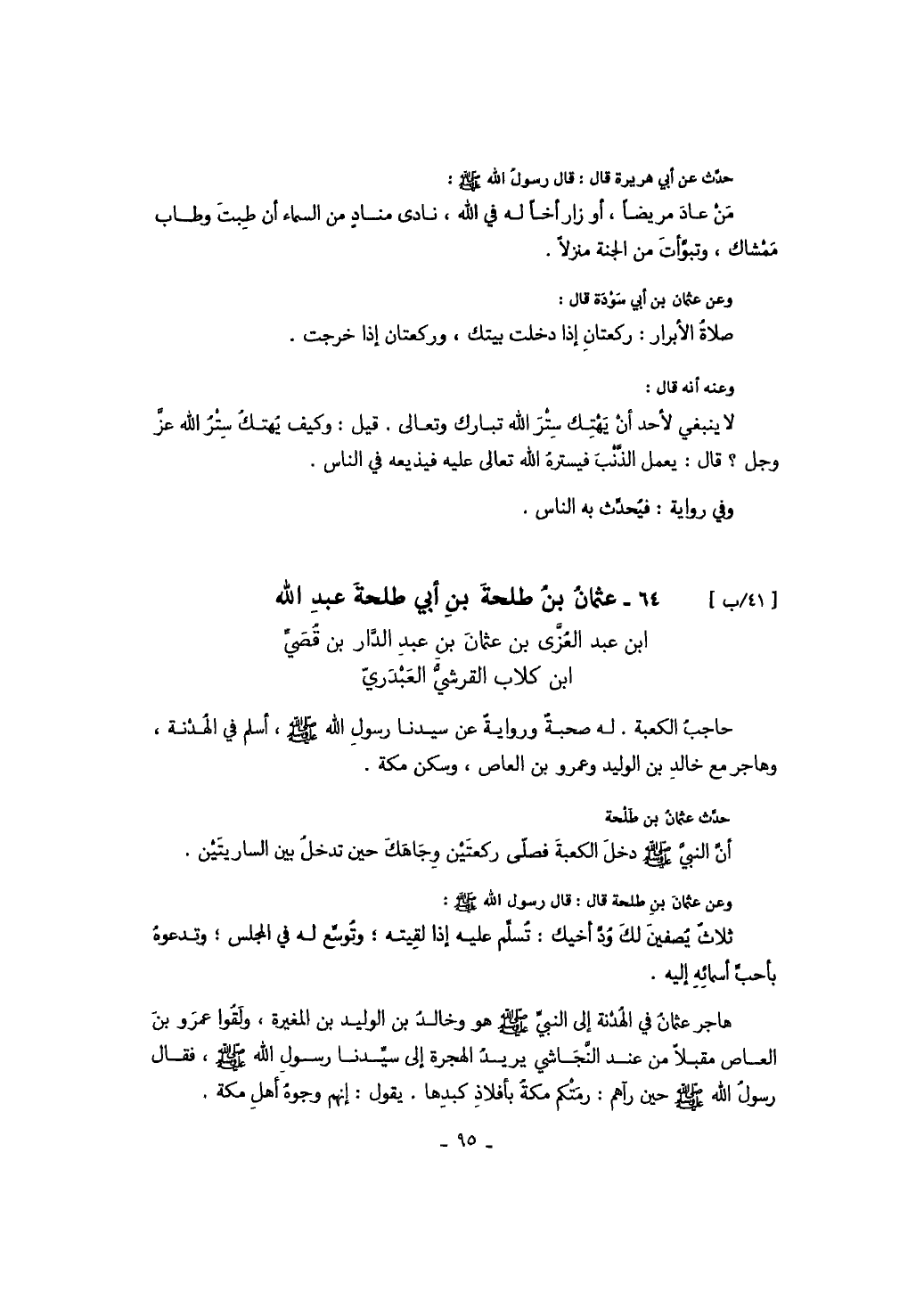 وعن عثمان بن طلحة قال: قال: قال رسول الله صَلَّى اللهُ عَلَيْهِ وَسَلَّمَ: " ثلاث يصفين لك ود أخيك: تسلم عليه إذا لقيته، وتوسع له المجلس، وتدعوه بأحب أسمائه إليه.
