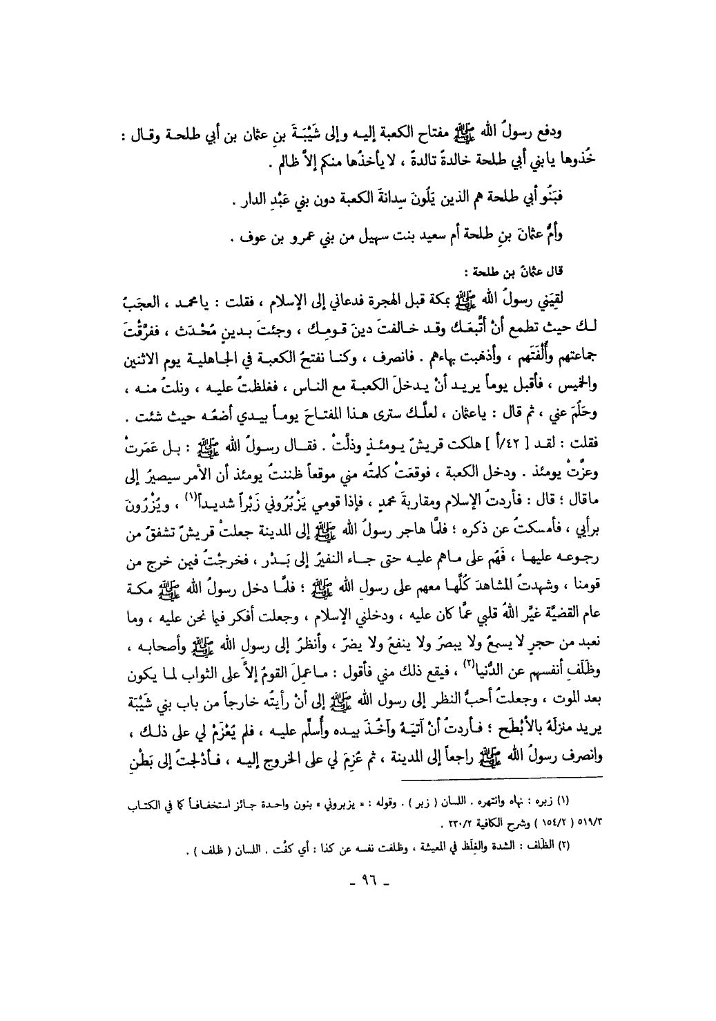 قال عثمان بن طلحة: لقيني رسول الله صَلَّى اللهُ عَلَيْهِ وَسَلَّمَ بمكة قبل الهجرة فدعاني إلى الإسلام، فقلت: يا محمد، العجب لك حيث تطمع أن أتبعك وقد خالفت دين قومك، وجئت بدين محدث، ففرقت جماعتهم وألفتهم، وأذهبت بهاءهم. فانصرف، وكنا نفتح الكعبة في الجاهلية يوم الاثنين والخميس، فأقبل يوماً يريد أن يدخل الكعبة مع الناس، فغلظت عليه، ونلت منه، وحلم عني، ثم قال: يا عثمان، لعلك سترى هذا المفتاح يوماً بيدي أضعه حيث شئت. فقلت: لقد هلكت قريش يومئذ وذلت. فقال رسول الله صَلَّى اللهُ عَلَيْهِ وَسَلَّمَ: بل عمرت وعزت يومئذ. ودخل الكعبة، فوقعت كلمته مني موقعاً ظننت يومئذ أن الأمر سيصير إلى ما قال: قال: فأردت الإسلام ومقاربة محمد، فإذا قومي يزبروني زبراً شديداً، ويزرون برأيي، فأمسكت عن ذكره، فلما هاجر رسول الله صَلَّى اللهُ عَلَيْهِ وَسَلَّمَ إلى المدينة جعلت قريش تشفق من رجوعه عليها، فهم على ما هم عليه حتى جاء النفير إلى بدر، فخرجت فيمن خرج من قومنا، وشهدت المشاهد كلها معهم على رسول الله صَلَّى اللهُ عَلَيْهِ وَسَلَّمَ: فلما دخل رسول الله صَلَّى اللهُ عَلَيْهِ وَسَلَّمَ مكة عام القضية غير الله قلبي عما كان عليه، ودخلني الإسلام، وجعلت أفكر فيما نحن عليه، وما نعبد من حجر لا يسمع ولا يبصر ولا ينفع ولا يضر، وأنظر رسول الله صَلَّى اللهُ عَلَيْهِ وَسَلَّمَ وأصحابه وظلف أنفسهم عن الدنيا، فيقع ذلك مني فأقول: ما عمل القوم إلا على الثواب لما يكون بعد الموت، وجعلت أحب النظر إلى رسول الله صَلَّى اللهُ عَلَيْهِ وَسَلَّمَ إلى أن رأيته خارجاً من باب بني شيبة يريد منزلة بالأبطح، فأردت أن آتيه وآخذ بيده وأسلم عليه، فلم يعزم لي على ذلك، وانصرف رسول الله صَلَّى اللهُ عَلَيْهِ وَسَلَّمَ راجعاً إلى المدينة، ثم عزم على الخروج إليه، فأدلجت إلى بطن