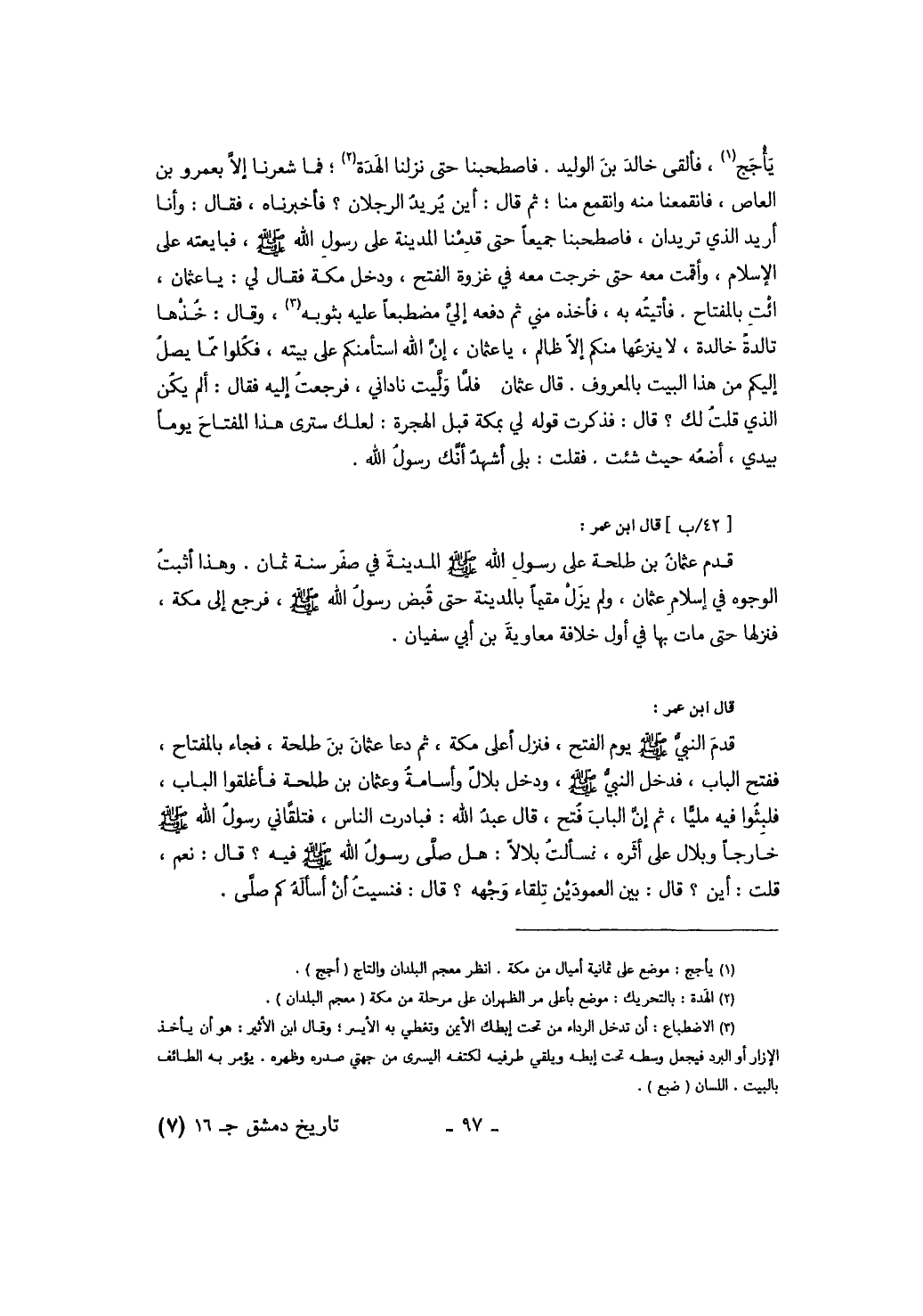 يأجج، فألقى خالد بن الوليد. فاصطبحنا حتى نزلناه الهدة، فما شعرنا إلا بعمرو بن العاص، فانقمعنا منه وانقمع منا، ثم قال: أين يريد الرجلان؟ فأخبرناه، فقال: وأنا أريد الذي تريدان، فاصطحبنا جميعاً حتى قدمنا المدينة على رسول الله صَلَّى اللهُ عَلَيْهِ وَسَلَّمَ، فبايعته على الإسلام، وأقمت معه حتى خرجت معه في غزوة الفتح، ودخل مكة فقال لي: يا عثمان، ائت بالمفتاح. فأتيته به، فأخذه مني ثم دفعه إلي مضطبعاً عليه بثوبه، وقال: خذها تالدة خالدة، لا ينزعها منكم إلا ظالم، يا عثمان، إن الله استأمنكم على بيته، فكلوا مما يصل إليكم من هذا البيت بالمعروف. قال عثمان فلما وليت ناداني، فرجعت إليه فقال: ألم يكن الذي قلت لك؟ قال: فذكرت قوله لي بمكة قبل الهجرة: لعلك سترى هذا المفتاح يوماً بيدي، أضعه حيث شئت. فقلت: بلى أشهد أنك رسول الله.