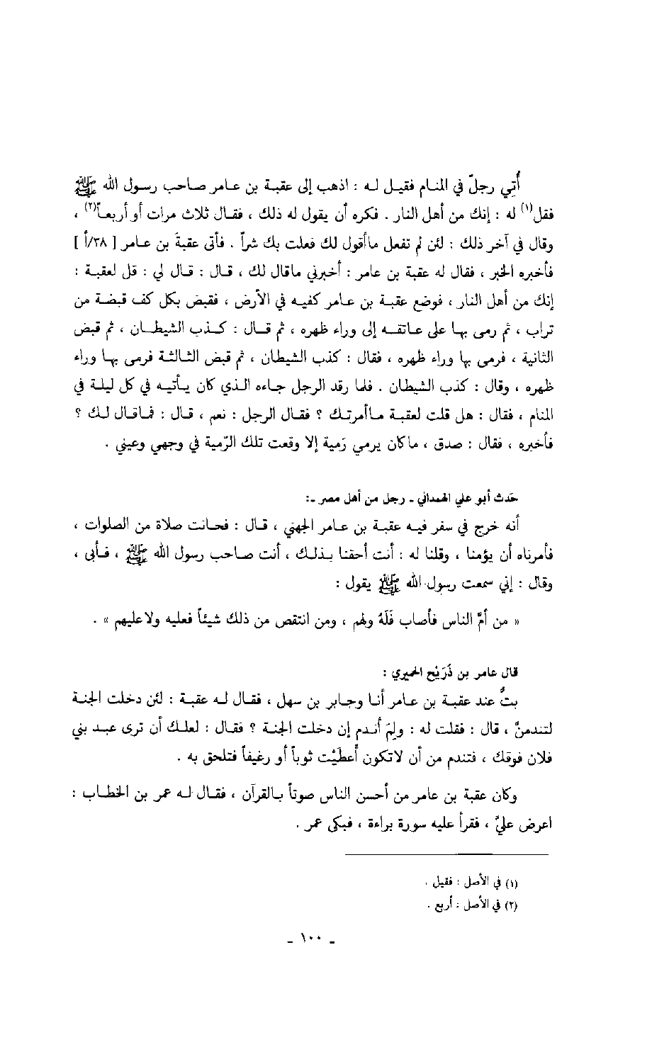 أتي رجلٌ في المنام فقيل له: اذهب إلى عقبة بن عامر صاحب رسول الله صَلَّى اللهُ عَلَيْهِ وَسَلَّمَ فقل له: إنك من أهل النار. فكره أن يقول له ذلك، فقال ثلاث مرات أو أربعاً، وقال في آخر ذلك: لئن لم تفعل ما أقول لك فعلت بك شراً. فأتى عقبة بن عامر فأخبره الخبر، فقال له عقبة بن عامر: أخبرني ما قال لك، قال: قال لي: قل لعقبة: إنك من أهل النار، فوضع عقبة بن عامر كفيه في الأرض، فقبض بكل كف قبضة من تراب، ثم رمى بها على عاتقه إلى وراء ظهره، ثم قال: كذب الشيطان، ثم قبض الثانية، فرمى بها وراء ظهره، فقال: كذب الشيطان، ثم قبض الثالثة فرمى بها وراء ظهره، وقال: كذب الشيطان. فلما رقد الرجل جاءه الذي كان يأتيه في كل ليلة في المنام، فقال: هل قلت لعقبة ما أمرتك؟ فقال الرجل: نعم، قال: فما قال لك؟ فأخبره، فقال: صدق، ما كان يرمي رمية إلا وقعت تلك الرّمية في وجهي وعيني.