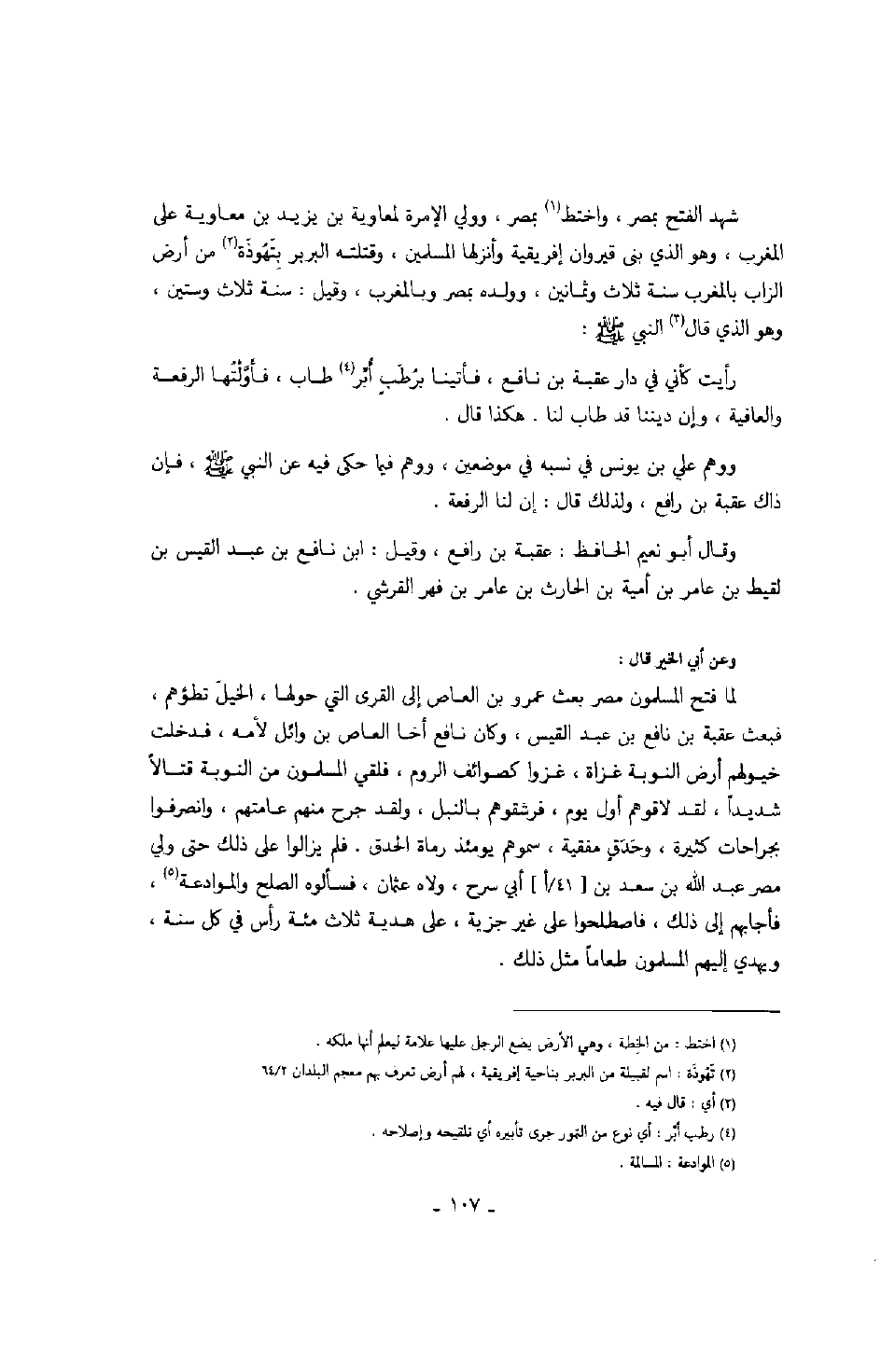 وعن أبي الخير قال: لما فتح المسلمون مصر بعث عمرو بن العاص إلى القرى التي حولها، الخيل تطؤهم، فبعث عقبة بن نافع بن عبد القيس، وكان نافع أخا العاص بن وائل لأمه، فدخلت خيولهم أرض النوبة غزاة، غزوا كصوائف الروم، فلقي المسلمون من النوبة قتالاً شديداً، لقد لاقوهم أول يوم، فرشقوهم بالنبل، ولقد جرح منهم عامتهم، وانصرفوا بجارحات كثيرة. وحذق ٍ بفقية، سموهم يومئذ رماة الحدق. فلم يزالوا على ذلك حتى ولي مصر عبد الله بن سعد بن أبي سرح، ولاه عثمان، فسألوه الصلح والموادعة، فأجابهم إلى ذلك، فاصطلحوا على غير جزية، على هداية ثلاث مئة رأس في كل سنة، ويهدي إليهم المسلمون طعاماً مثل ذلك.