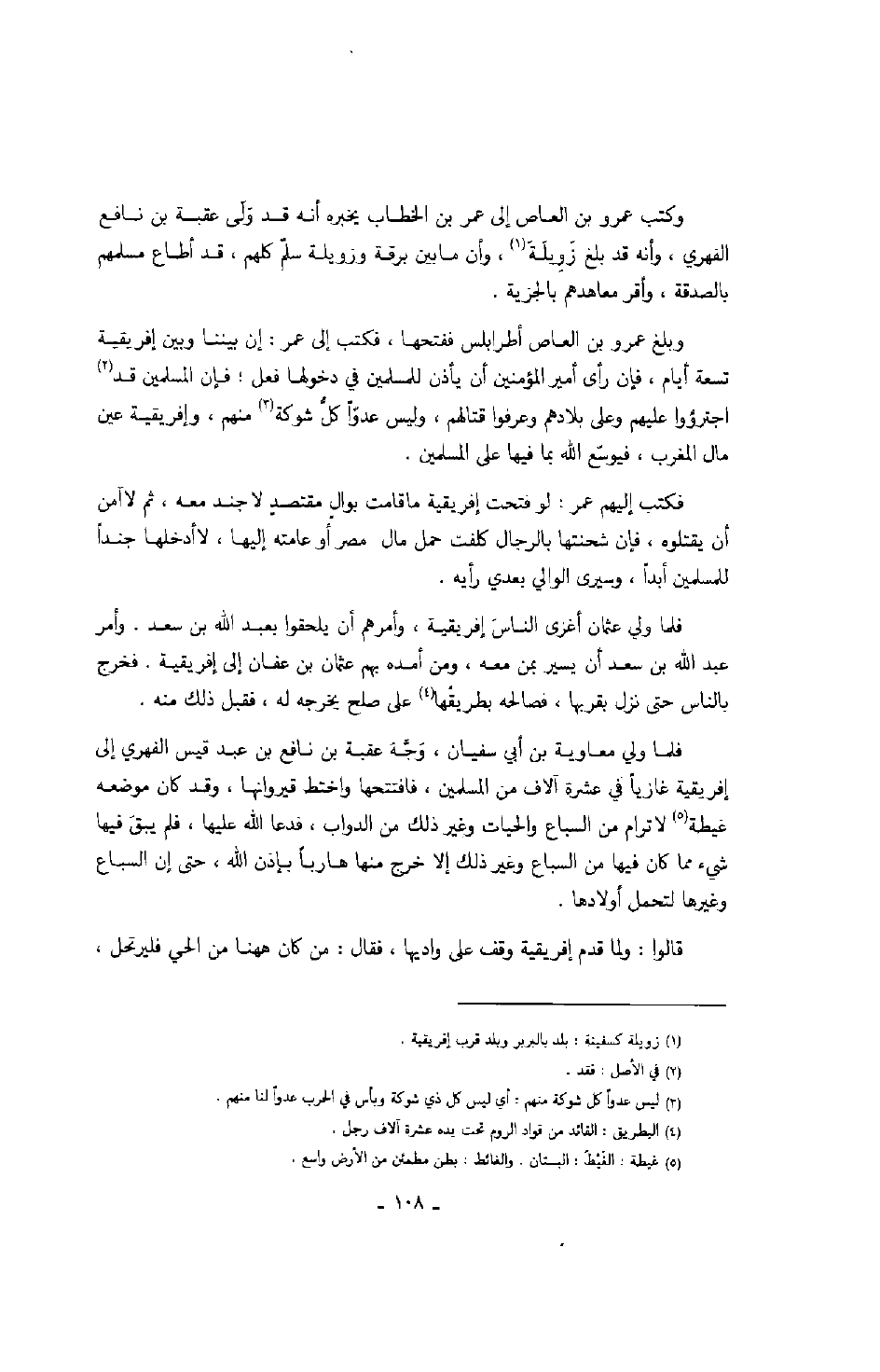 وكتب عمرو بن العاص إلى عمر بن الخطاب يخبره أنه قد ولّى عقبة بن نافع الفهري، وأنه قد بلغ زويلة، وأن ما بين برقة وزويلة سلمٌ كلهم، قد أطاع مسلمهم بالصدقة، وأقر معاهدهم بالجزية.