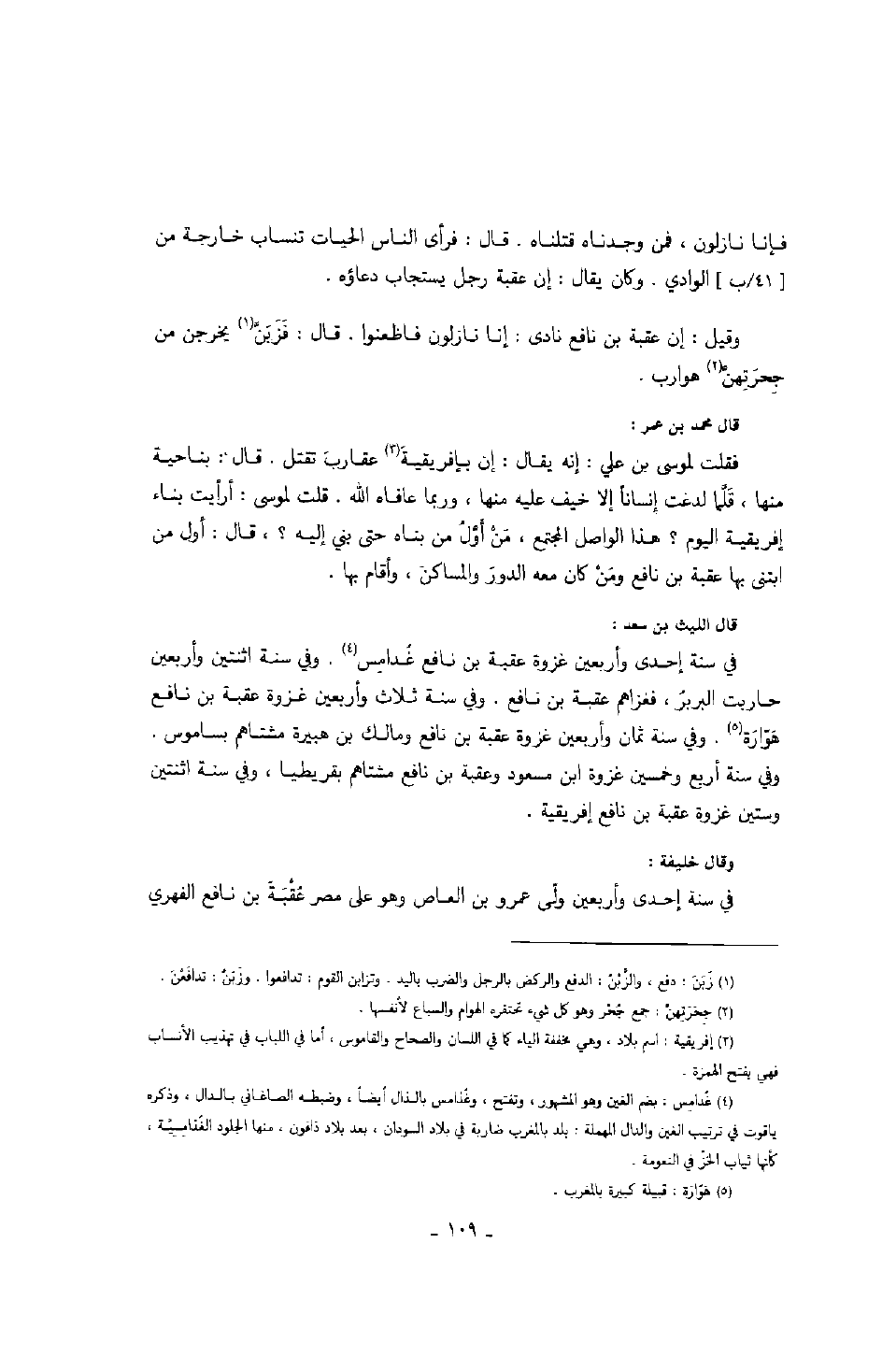 قال الليث بن سعد: في سنة إحدى وأربعين غزوة عقبة بن نافع غدامس. وفي سنة اثنتين وأربعين حاربت البربر، فغزاهم عقبة بن نافع. وفي سنة ثلاث وأربعين غزوة عقبة بن نافع هوّارة. وفي سنة ثمان وأربعين غزوة عقبة بن نافع ومالك بن هبيرة مشتاههم بساموس. وفي سنة أربع وخمسين غزوة ابن مسعود وعقبة بن نافع مشتاهم بقريطيا، وفي سنة اثنتين وستين غزوة عقبة بن نافع إفريقية.