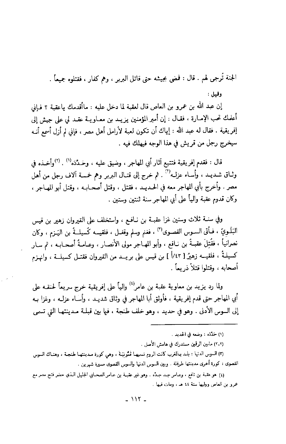 قال: فقدم إفريقية فتتبع آثار أبي المهاجر، وضيق عليه، وحدّده. وأخذه في وثاق شديد، وأساء عزله. ثم خرج إلى قتال البربر وهم خمسة آلاف رجل من أهل مصر. وأخرج بأبي المهاجر معه في الحديد، فقتل، وقتل أصحابه، وقتل أبو المهاجر، وكان قدوم عقبة والياً على أبي المهاجر سنة ثنتين وستين.
